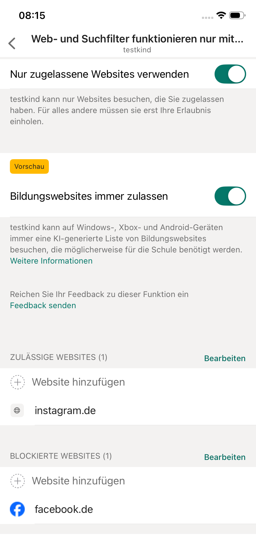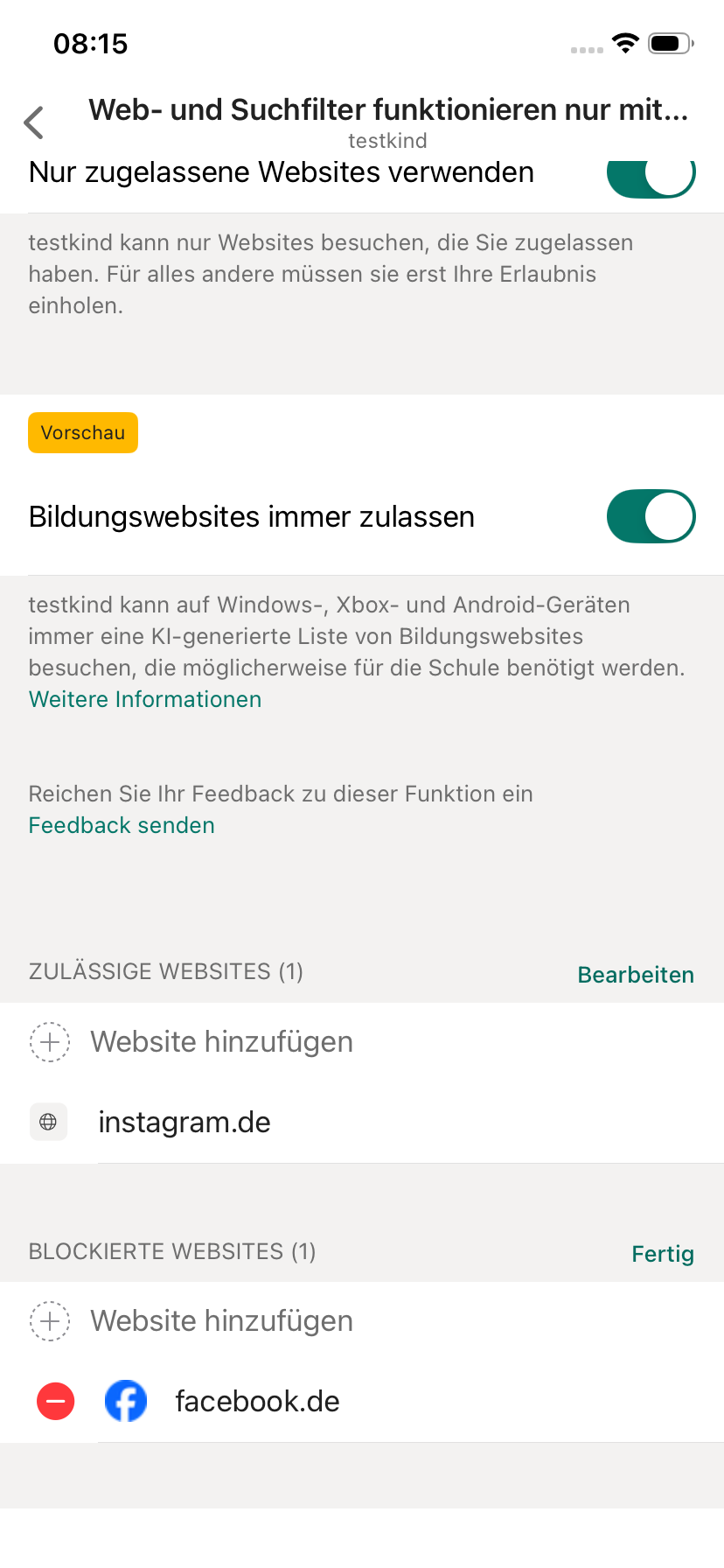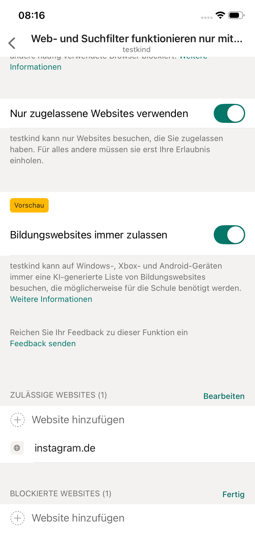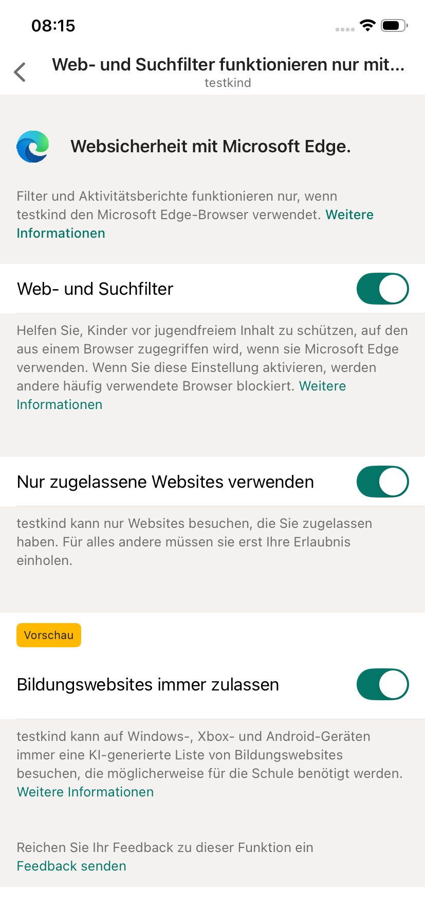 Wichtig:Jetzt kann Ihr Kind nur noch den Microsoft Edge Browser haben.Es werden auch andere Browser gesperrt.Zum Beispiel unter Windows, auf der Xboxund auf Android-Geräten.