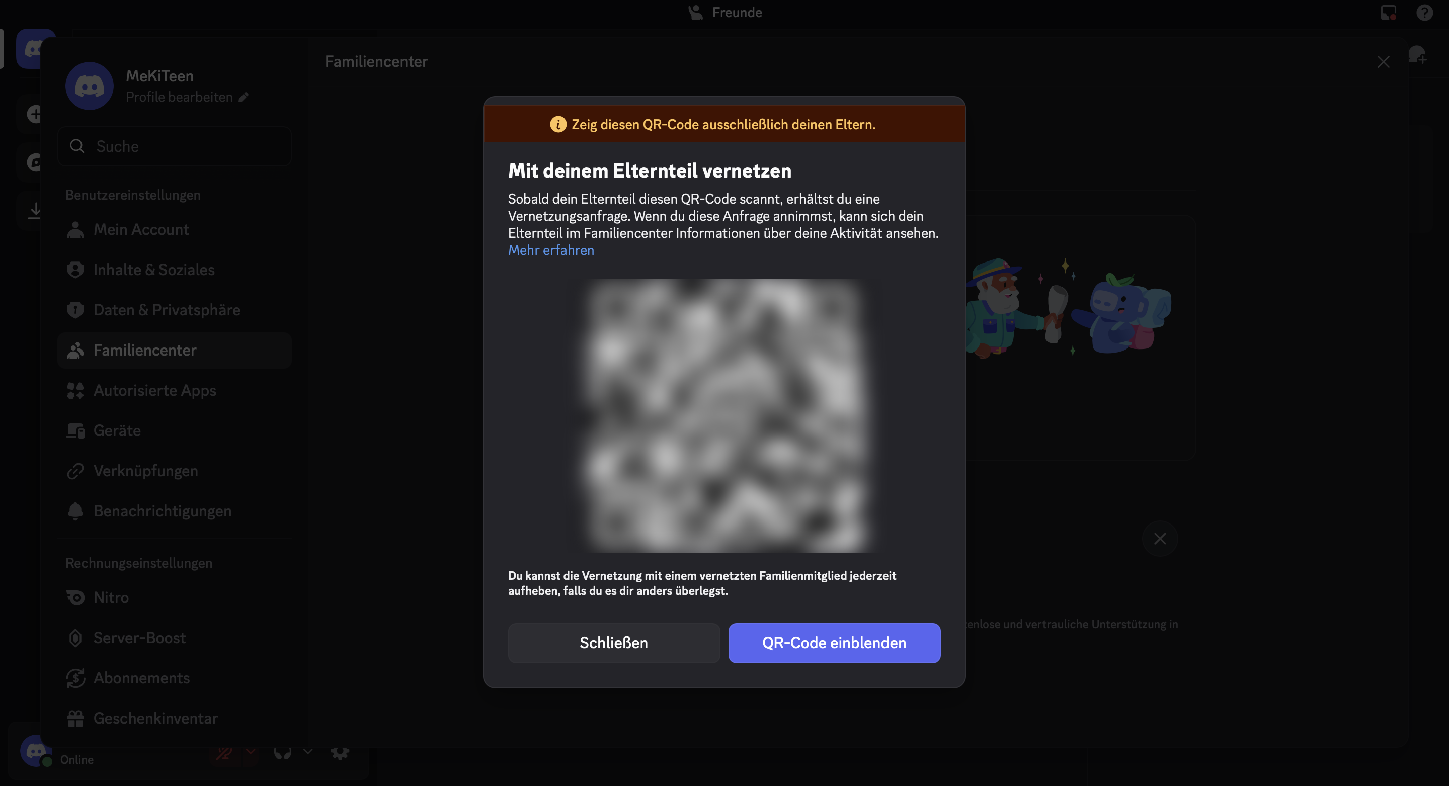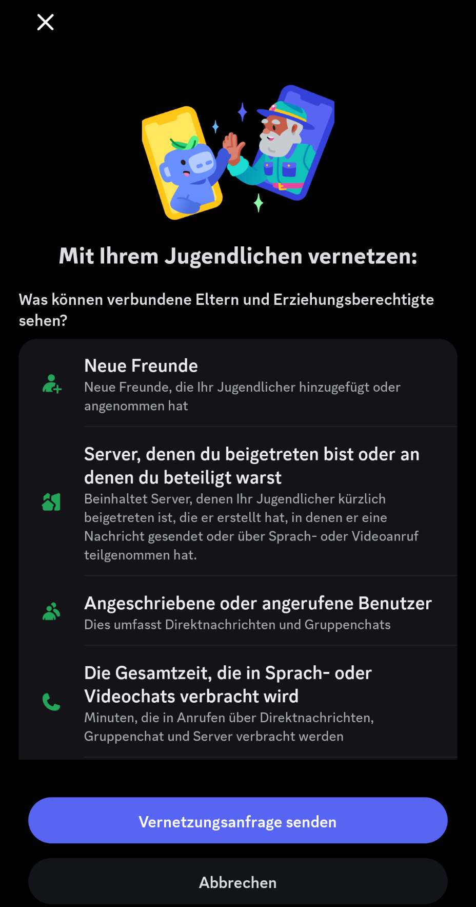 10. Scannen Sie den QR-Code mit Ihrem Handy und melden Sie Sich im Browser oder über die Discord-App mit Ihrem Eltern·konto an. 11. Wählen Sie: Vernetzungs·anfrage senden12. Wählen Sie: Schließen