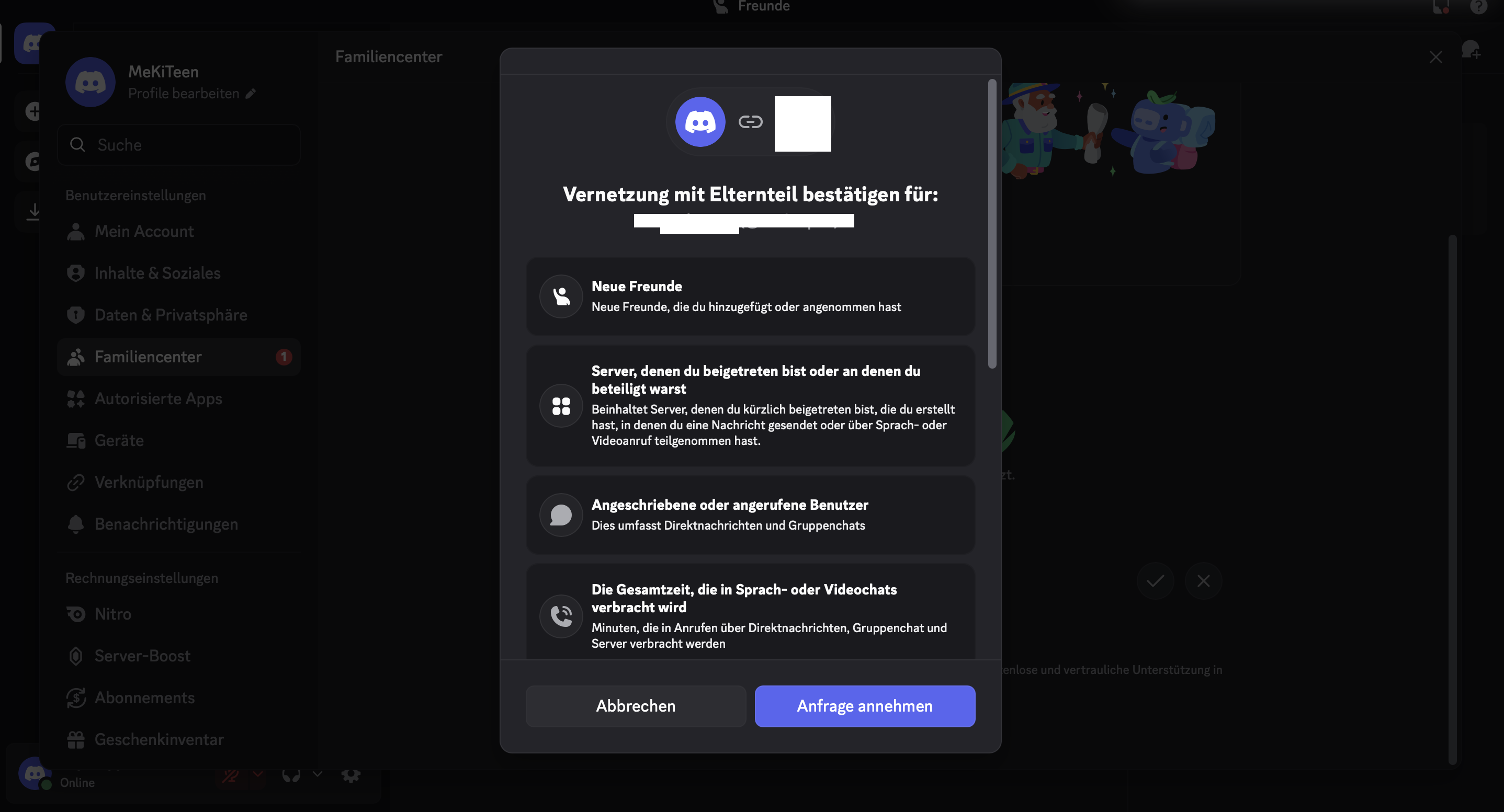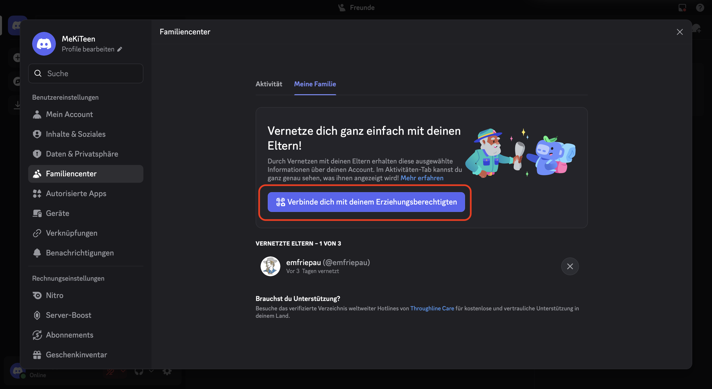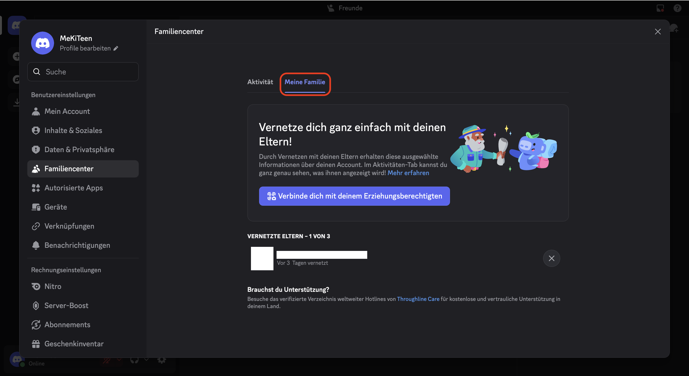 Jetzt sehen Sie unter Vernetzte Eltern – 1 von 3 Ihren Discord·namen.Sie bekommen außerdem eine E-Mail.Auch Ihr Kind bekommt eine E-Mail, wenn die Anfrage angenommen wurde.