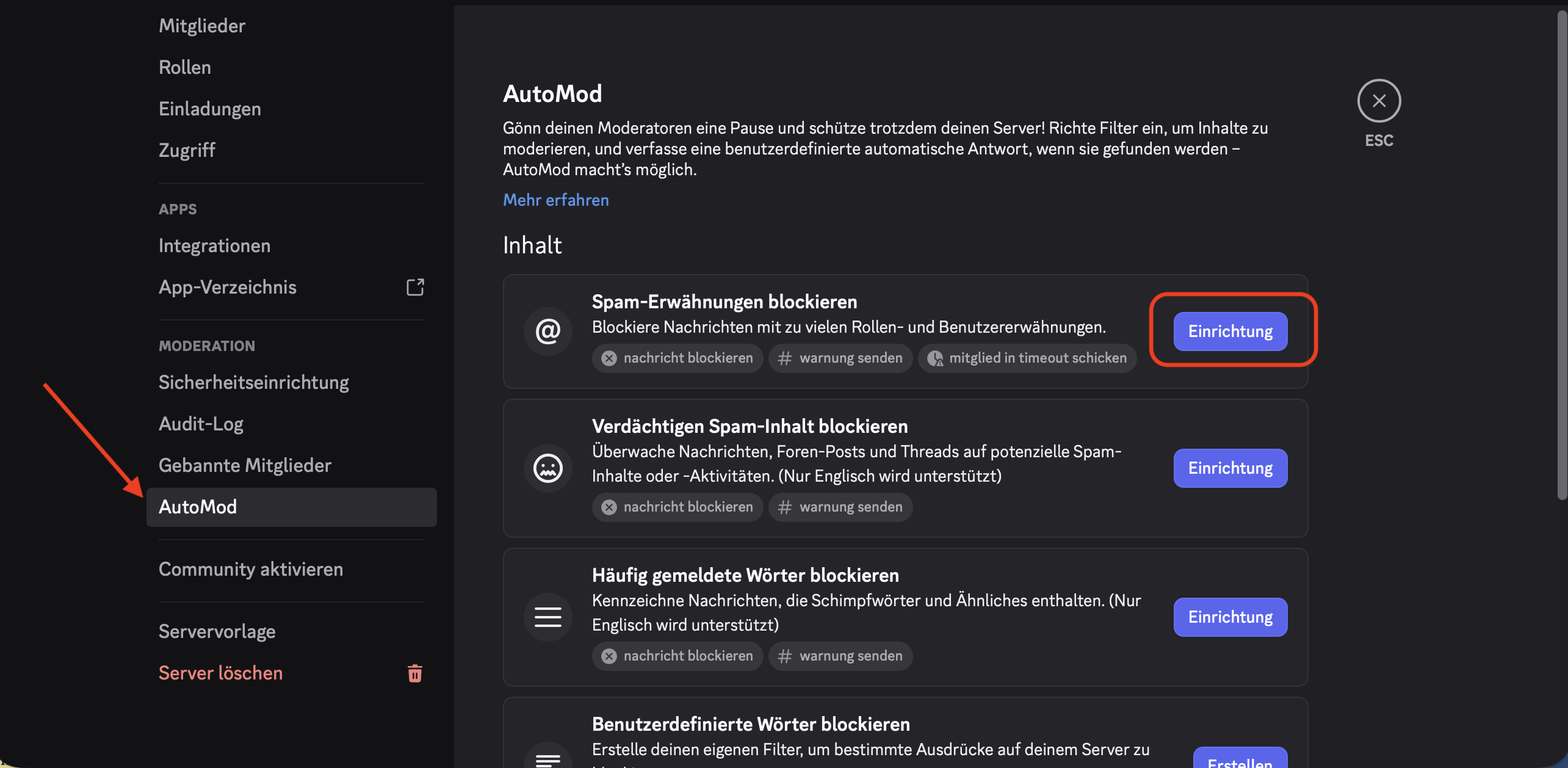 Dann können Sie Einstellungen machen. Zum Beispiel: Welche Inhalte sind erlaubt? Das geht über die Funktion Auto·Mod. Auto·Mod ist eine automatische Filter·funktion.