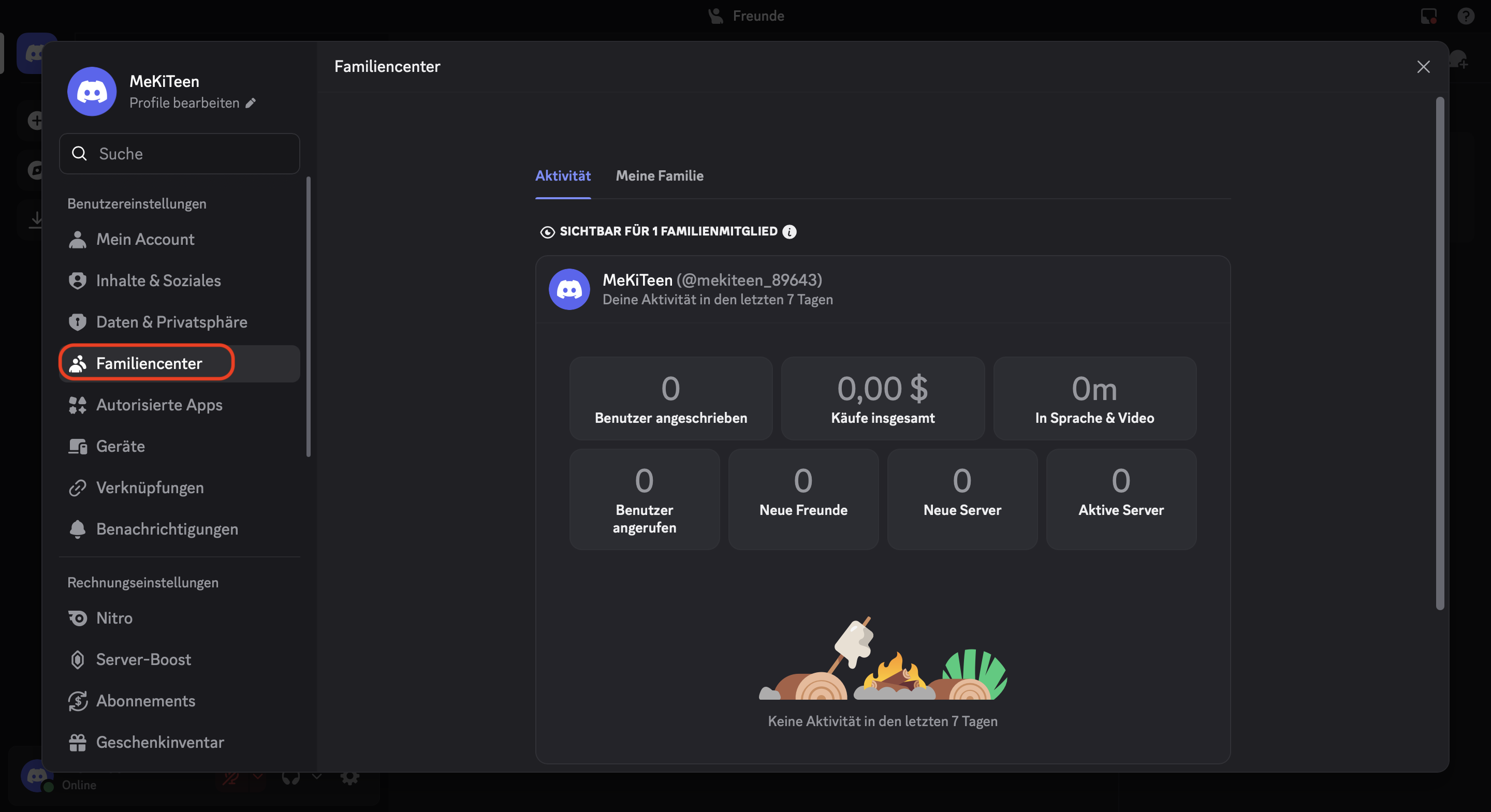 Im Discord Familien·center können Sie sehen, was Ihr Kind auf Discord macht.Die Übersicht zeigt die Aktivitäten pro Tag und pro Woche.Das können Sie sehen: