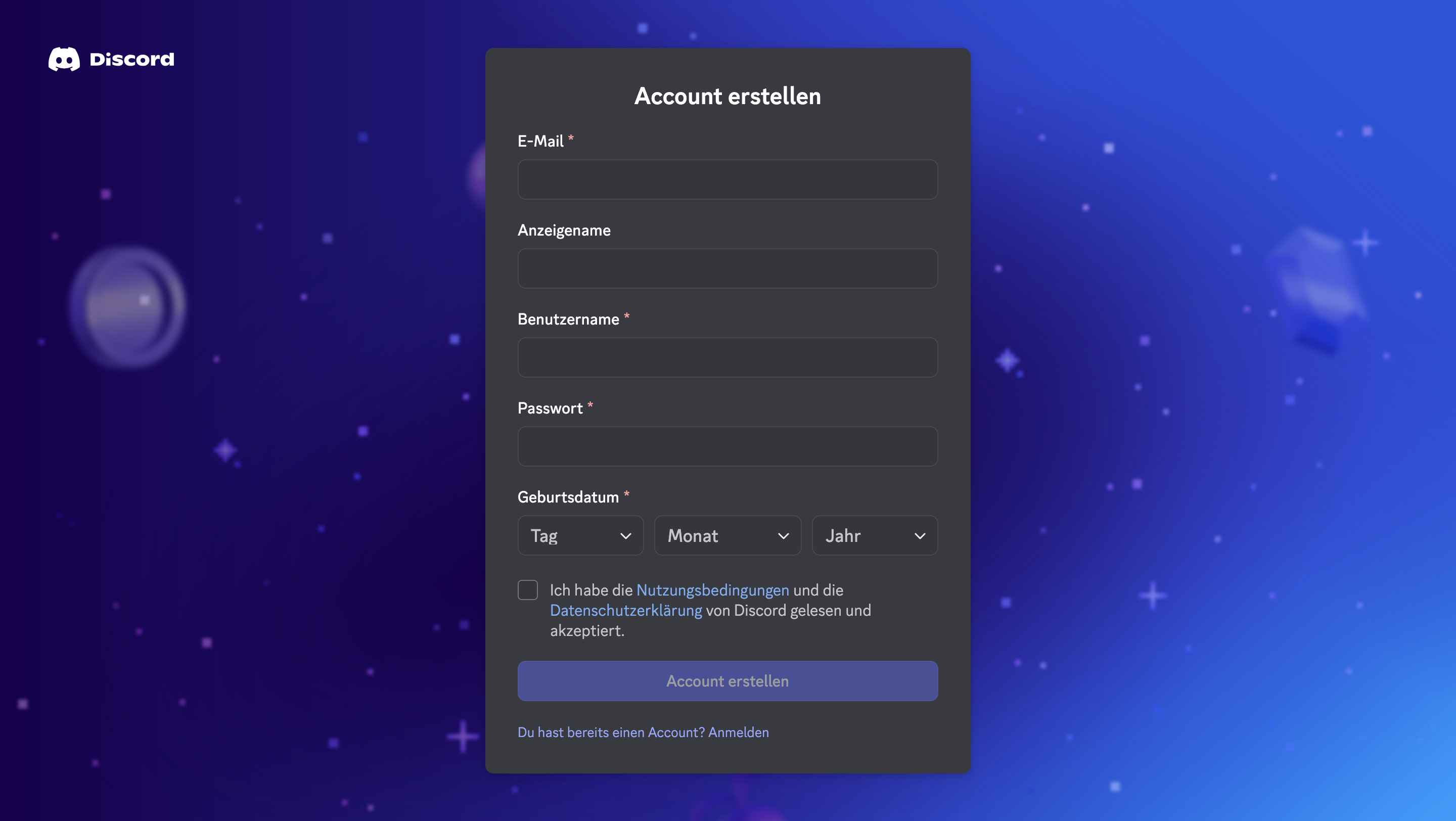 5. Geben Sie die E-Mailadresse von Ihrem Kind ein.6. Denken Sie Sich gemeinsam mit Ihrem jugendlichen Kind einen Anzeigen·namen aus. Dieser wird auch in öffentlichen Servern angezeigt.7. Geben Sie bei Benutzer·name den Namen von Ihrem Kind ein. 8. Geben Sie ein sicheres Passwort ein. 9. Geben Sie das Geburts·datum von Ihrem Kind ein. Um Discord nutzen zu können muss Ihr Kind mindestens 16 Jahre alt sein.10. Machen Sie einen Haken bei Ich habe die Nutzungs·bedingungen…11. Wählen Sie: Account erstellen.