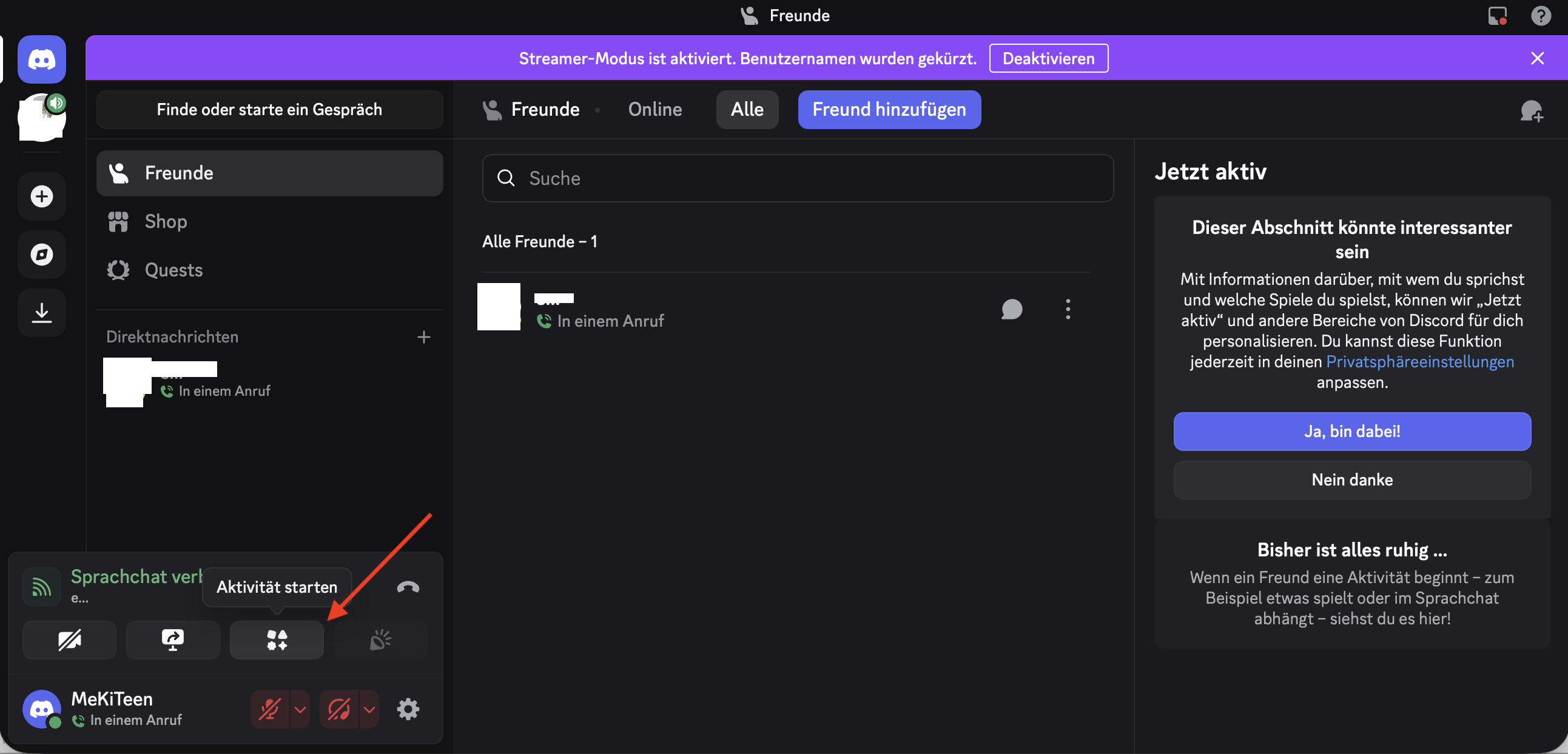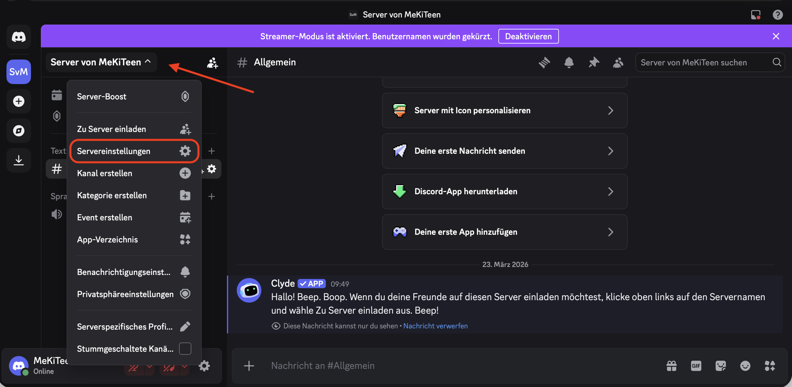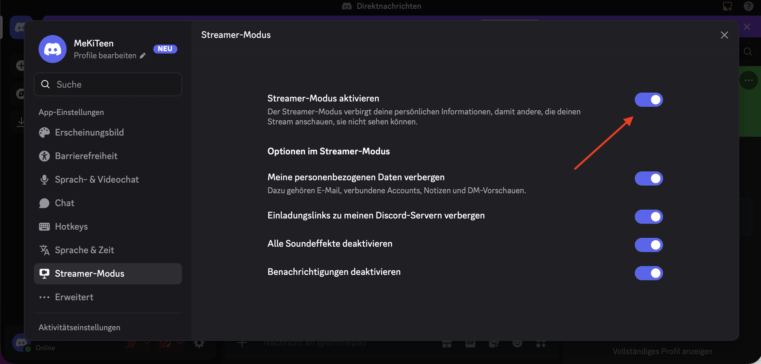 4. Scrollen Sie links im Menü runter zu App-Einstellungen.5. Wählen Sie: Streamer-Modus6. Aktivieren Sie den Schiebe·regler bei Streamer-Modus aktivieren.Schauen Sie, dass alle weiteren Schiebe·regler auf dieser Seite aktiviert sind.