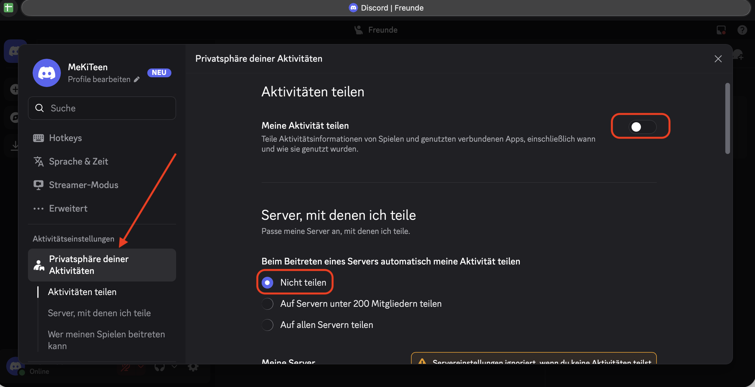 4. Scrollen Sie links im Menü nach unten zu Aktivitäts·einstellungen.5. Wählen Sie Privat·sphäre deiner Aktivitäten.6. Deaktivieren Sie den Schiebe·regler bei Meine Aktivitäten teilen.7. Wählen Sie unter Server, mit denen ich teile → Nicht teilen.