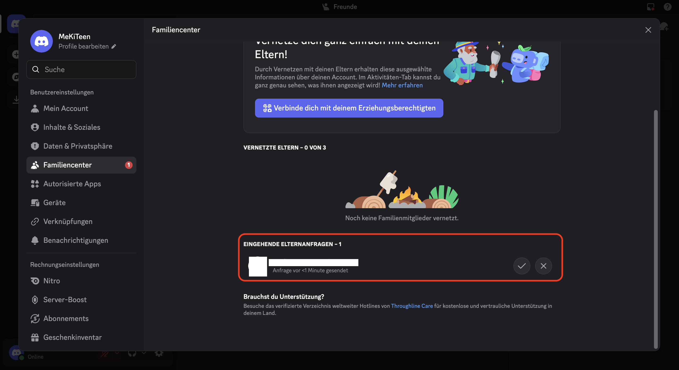 13. Sie sehen jetzt im Konto des Jugendlichen unter Vernetze Eltern → Eingehende Eltern·anfragen - 1 Ihren erwachsenen Discordnamen. Wählen Sie den Haken, um die Anfrage als Jugendlicher anzunehmen.