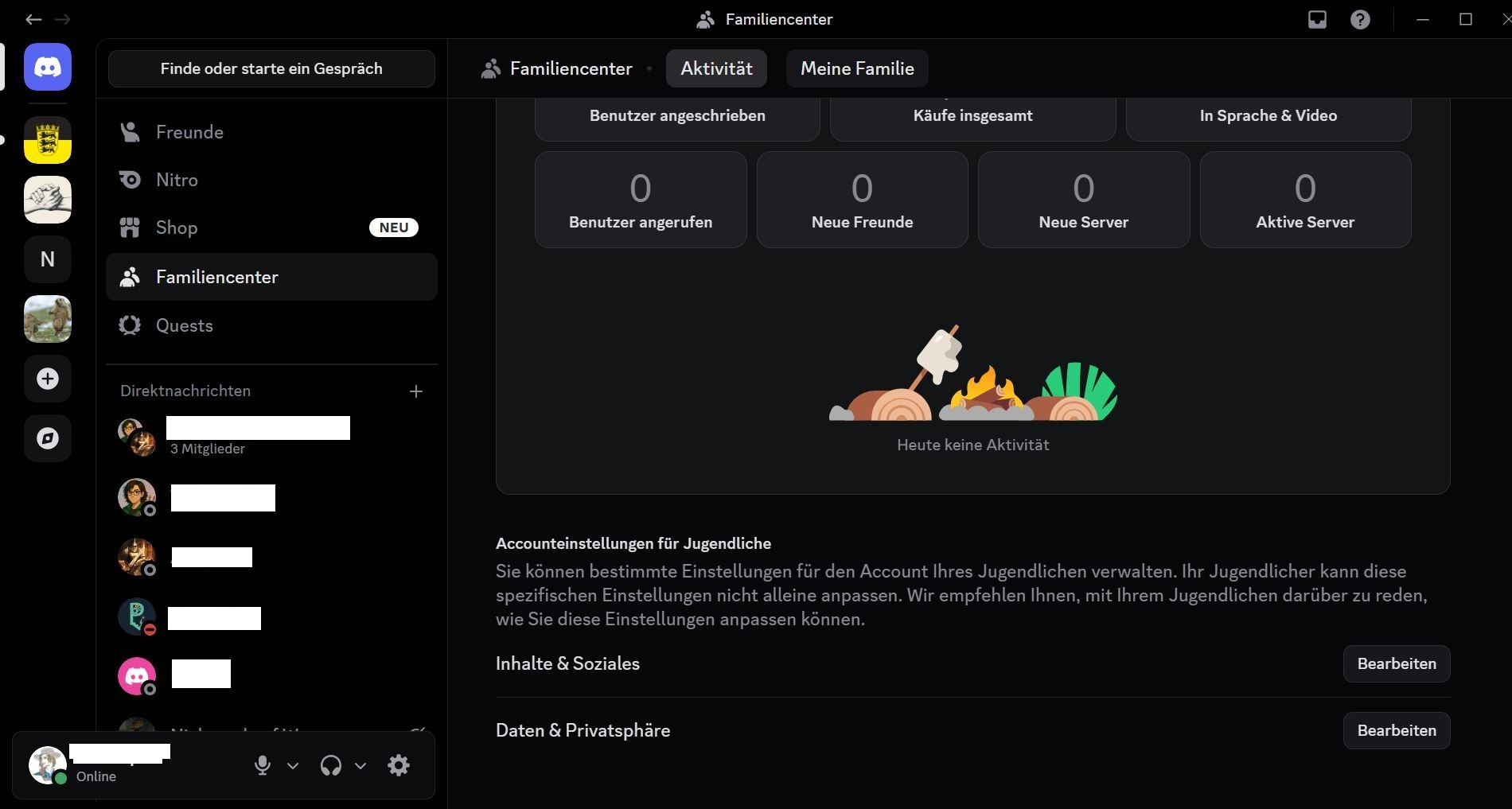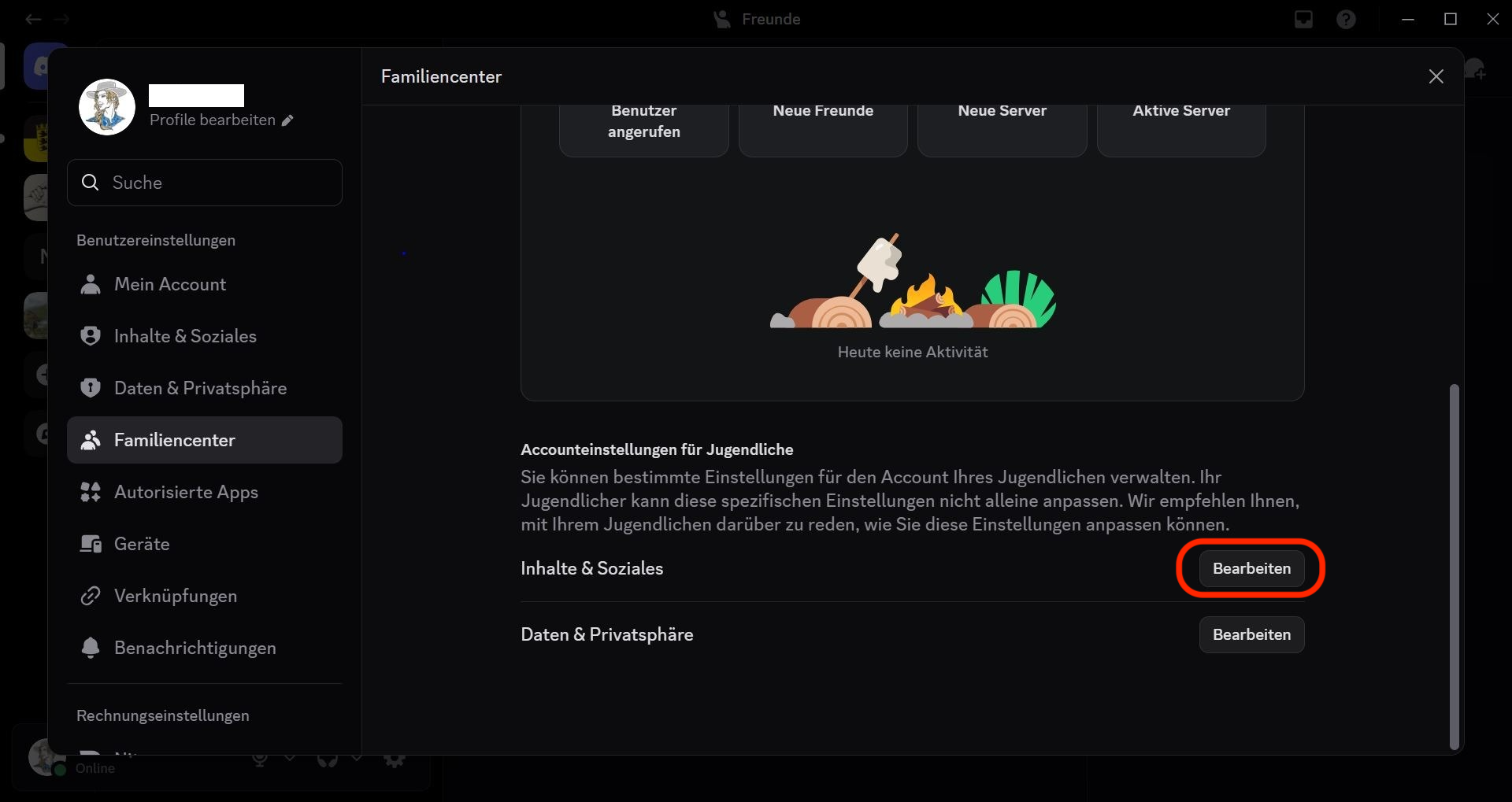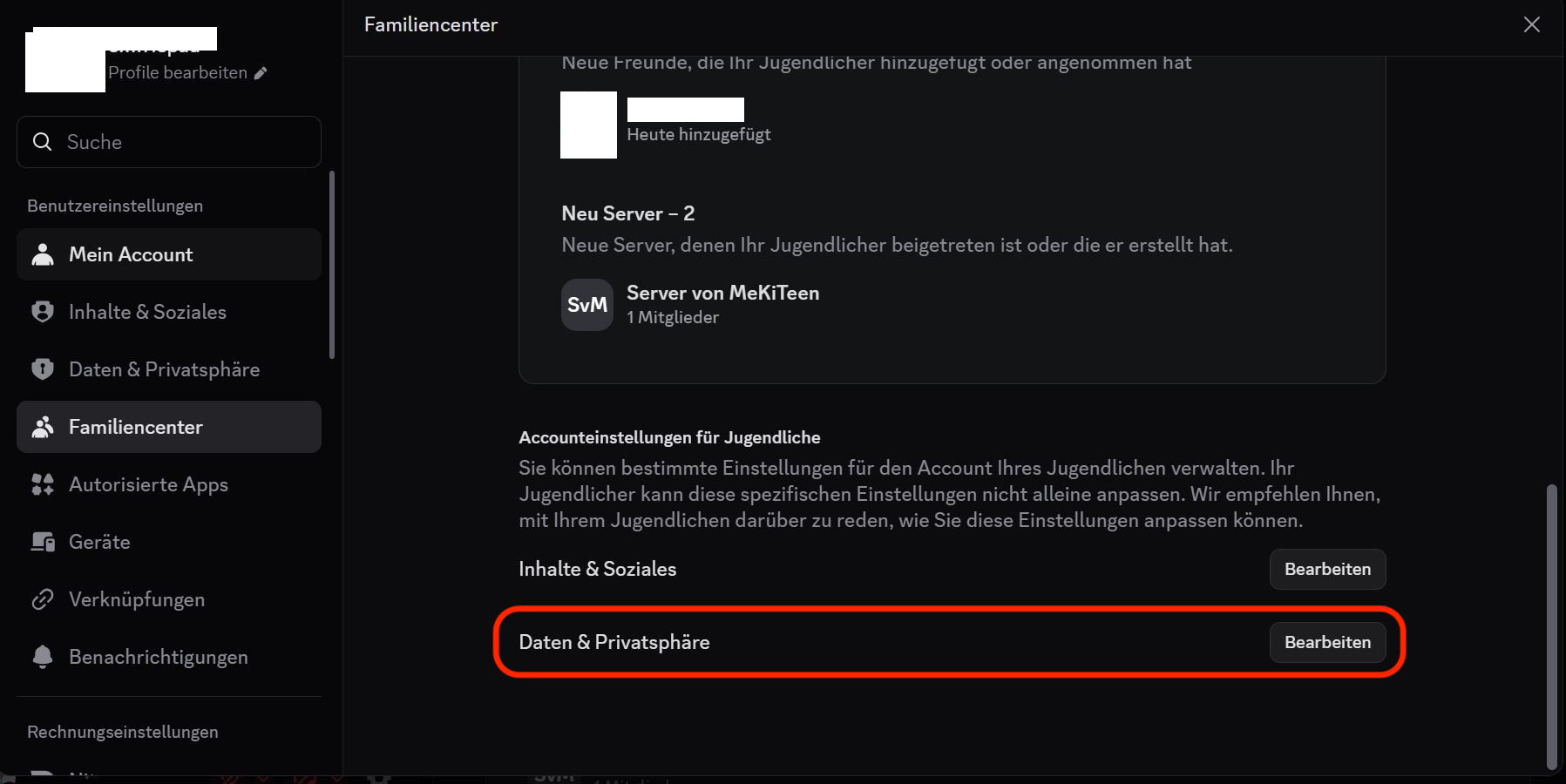 In Discord gibt es Einstellungen, die nicht im Familien·center gemacht werden können.Diese Einstellungen müssen direkt im Jugend·konto geändert werden.Ihr Kind kann diese Einstellungen dann leider auch wieder selbst ändern.