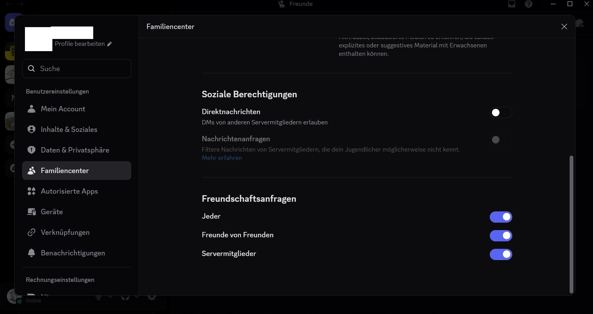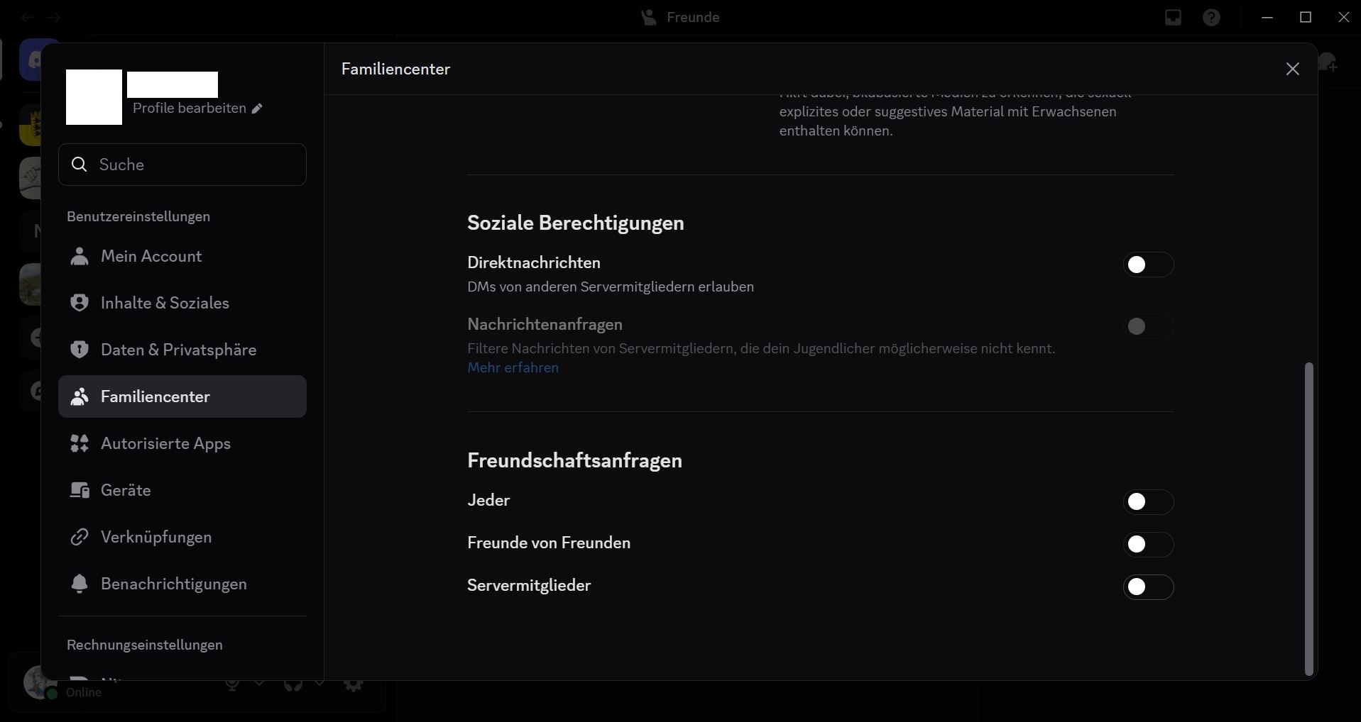 Auf Discord können Fremde Ihrem Kind Freundschafts·anfragen senden.Das ist ähnlich wie bei anderen sozialen Medien. Sie können einstellen: Fremde dürfen meinem Kind keine Anfragen senden.