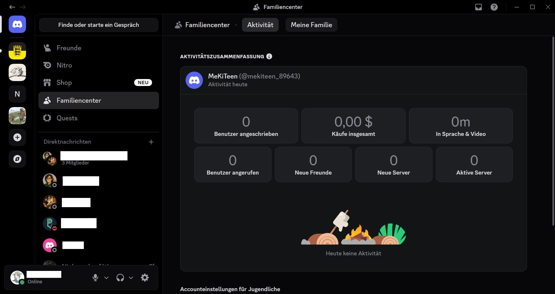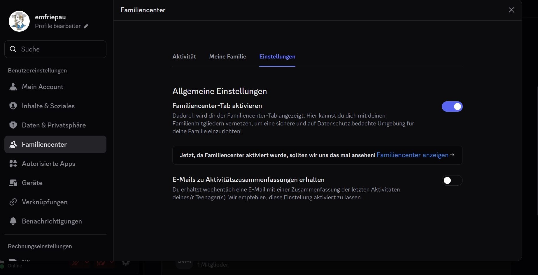 Ihr Kind ist zwischen 16 und 18 Jahren alt? Dann gibt es bei Discord ein Jugend·konto.Mit dem Jugend·konto können Sie auch das Familien-Center benutzen. Damit können Sie Einstellungen für Ihr Kind machen.