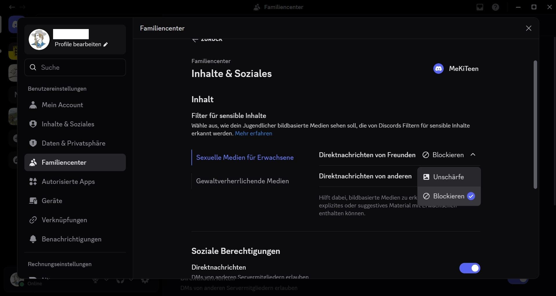 Discord hat eine Funktion zum Schutz vor sensiblen Inhalten.Dabei werden Bilder oder Nachrichten mit sexuellen oder gewaltvollen Inhalten unscharf gemacht oder blockiert.So kann Ihr Kind besser vor solchen Inhalten geschützt werden.