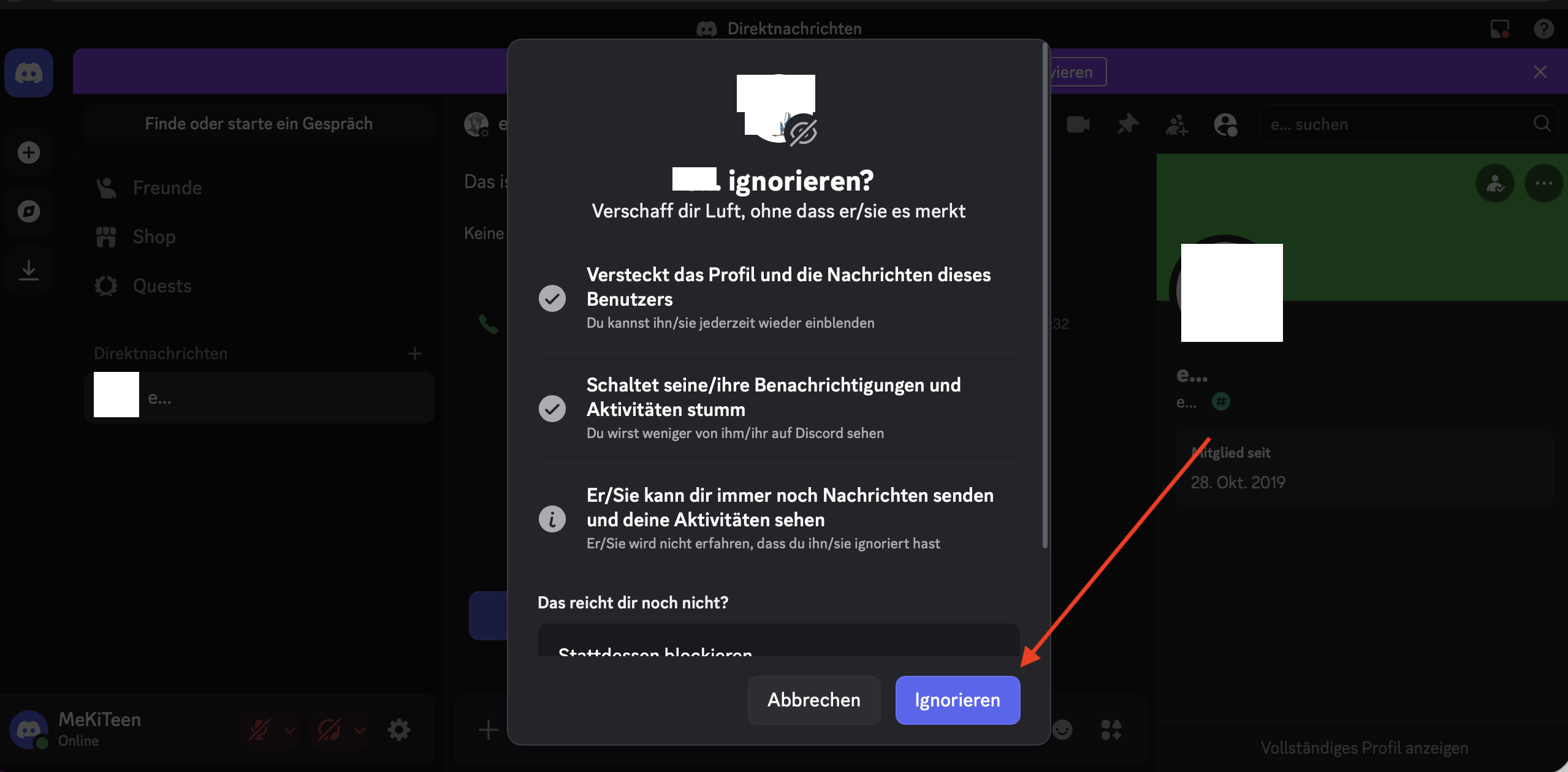 7. Wählen Sie: IgnorierenEs erscheint eine Nachricht von Discord, die erklärt, was diese Einstellung bewirkt.Sie können die Person auch direkt blockieren, wenn Sie möchten.