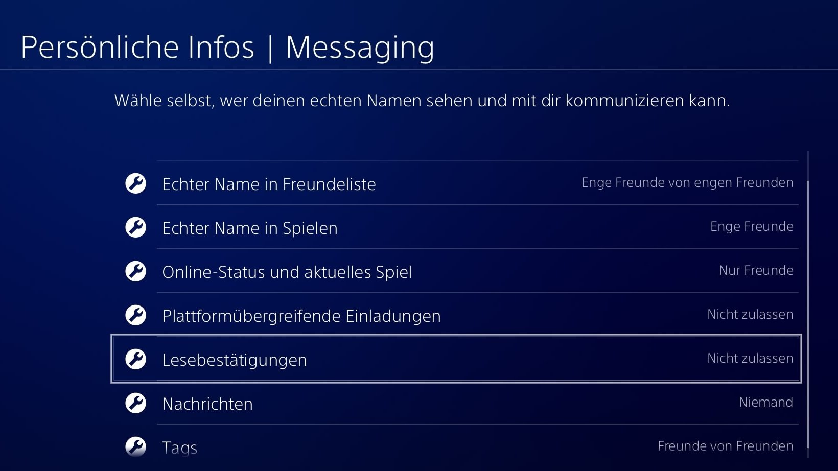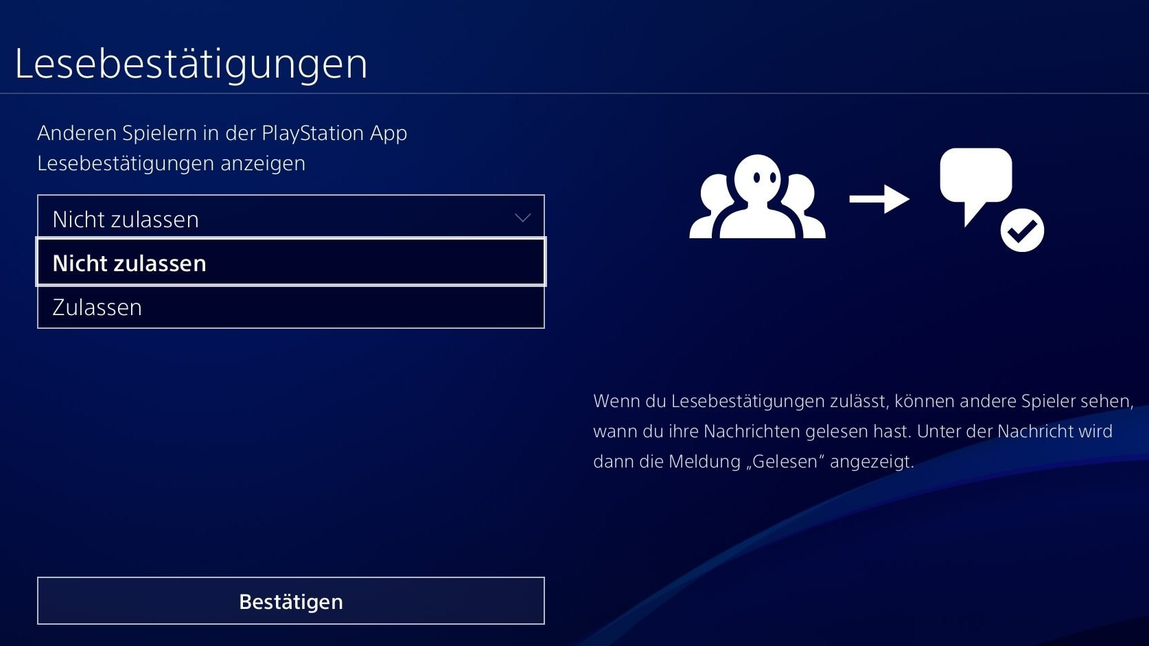 Ihr Kind kann auf der PlayStation 4 Nachrichten schreiben. Die Nachrichten haben auch eine Lese·bestätigung. Das bedeutet: Man kann sehen, ob die Nachricht gelesen wurde. Wir empfehlen: Deaktivieren Sie die Lese·bestätigung. Niemand muss wissen, ob Ihr Kind die Nachricht gelesen hat. Die Lese·bestätigung kann auch Stress machen. Ihr Kind denkt dann vielleicht:„Ich muss schnell antworten.“