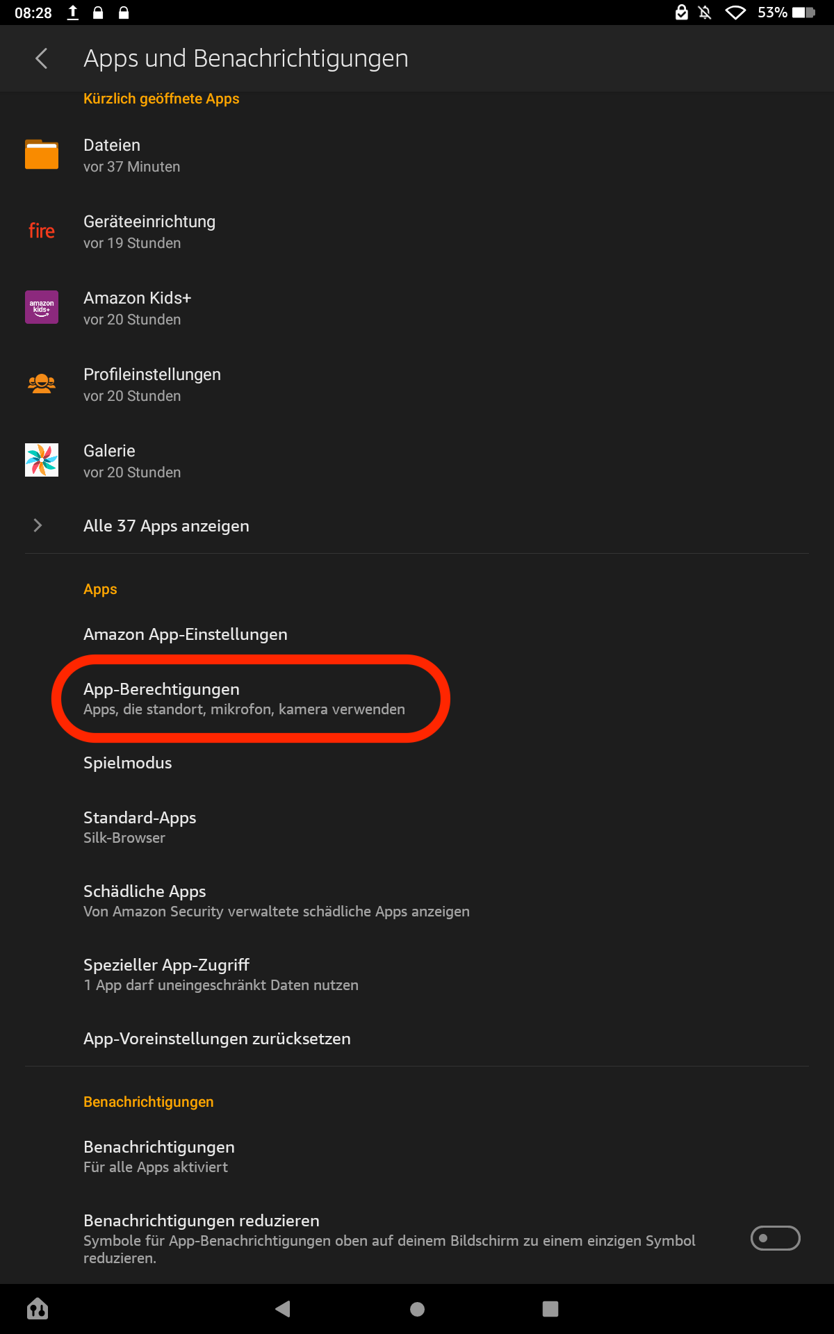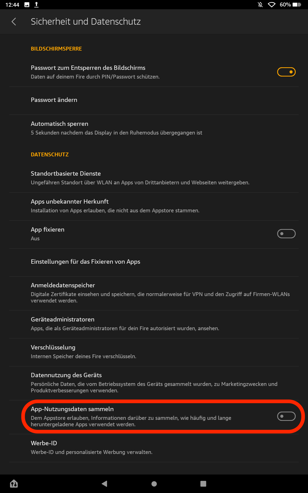 Wenn Sie nicht möchten, dass Ihr Amazon FireOS Informationen darüber sammelt, wie häufig und lange heruntergeladenen Apps verwendet werden, haben Sie die Möglichkeit, dies zu deaktivieren.