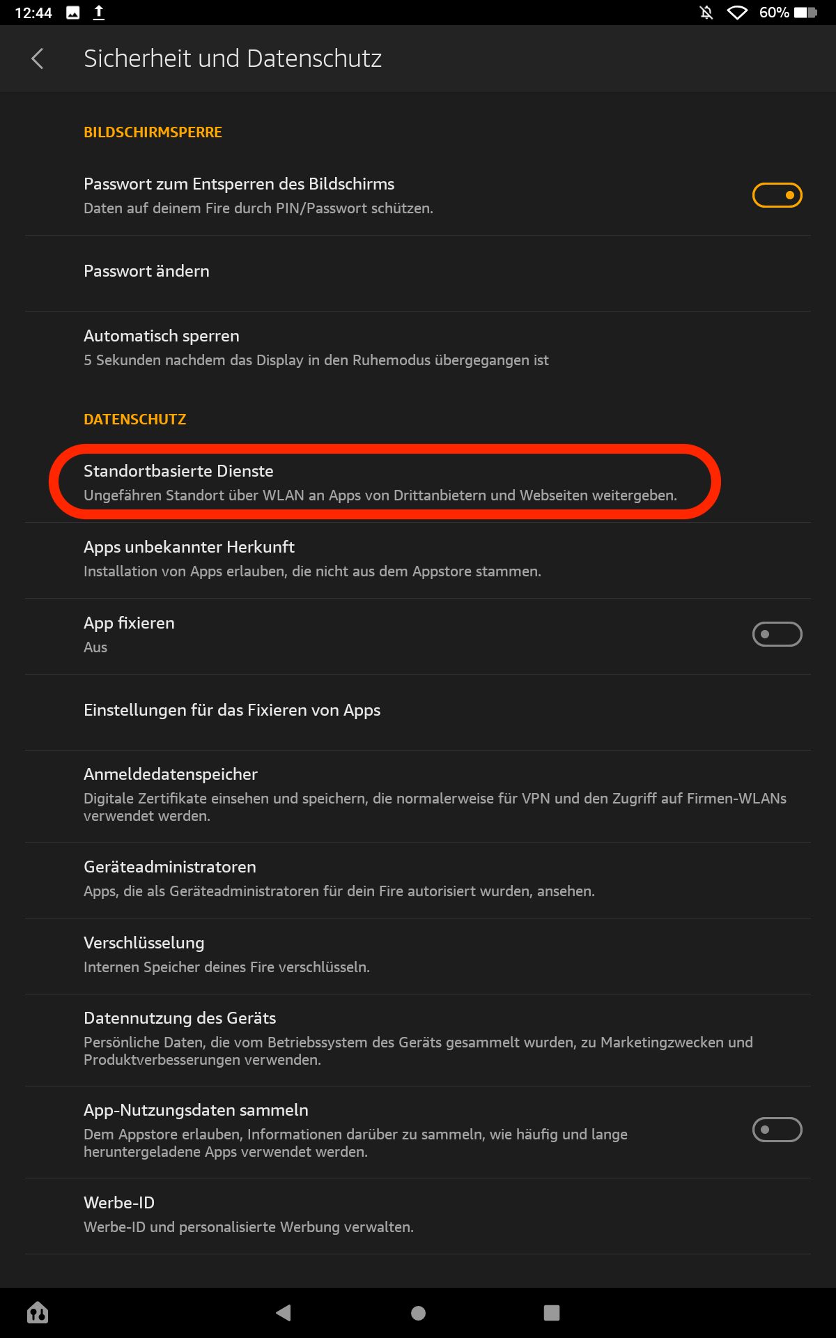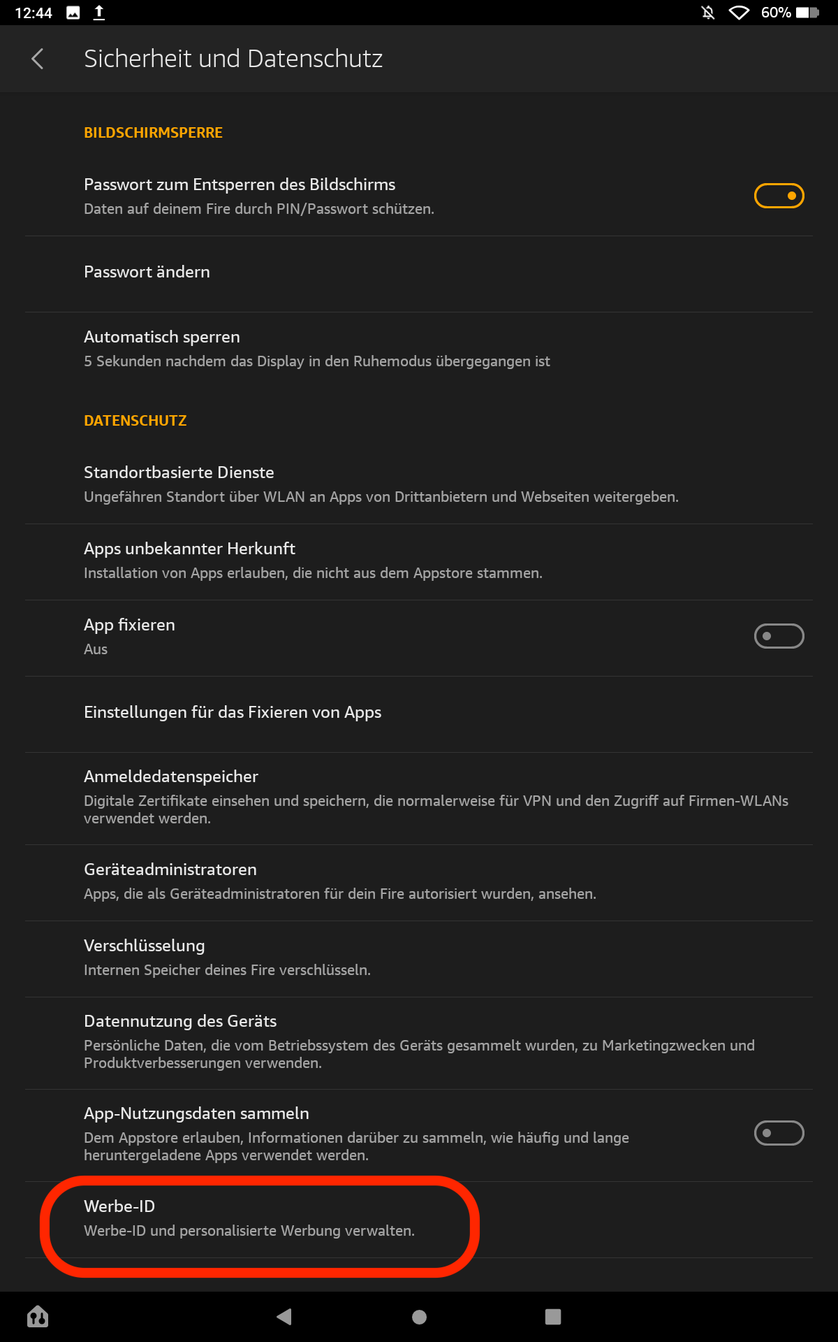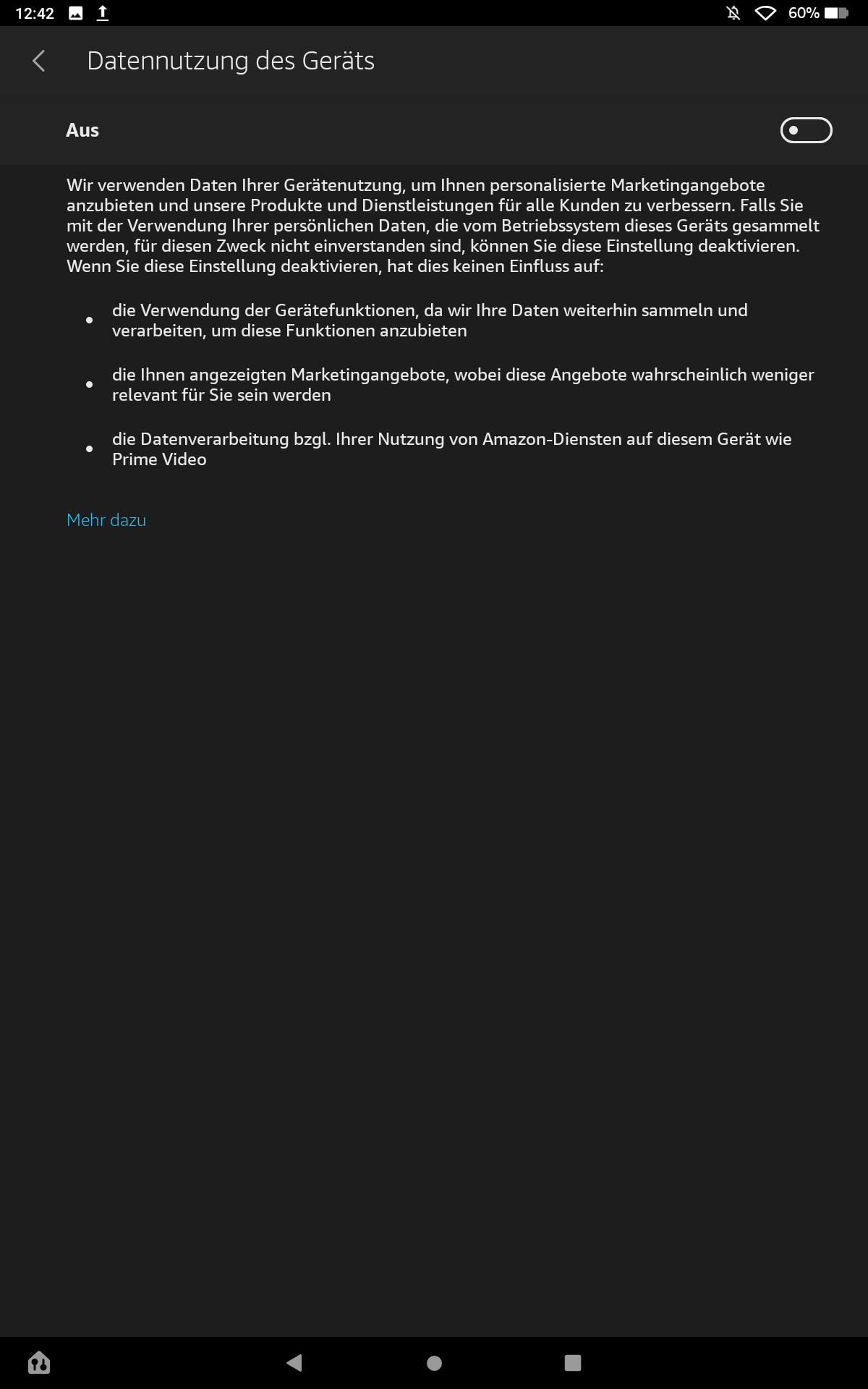 Wenn Sie nicht möchten, dass Ihr Amazon FireOS Informationen über Ihre Gerätenutzung sammelt und diese zur Erstellung von personalisierten Marketingangeboten nutzt, haben Sie die Möglichkeit, dies zu deaktivieren.