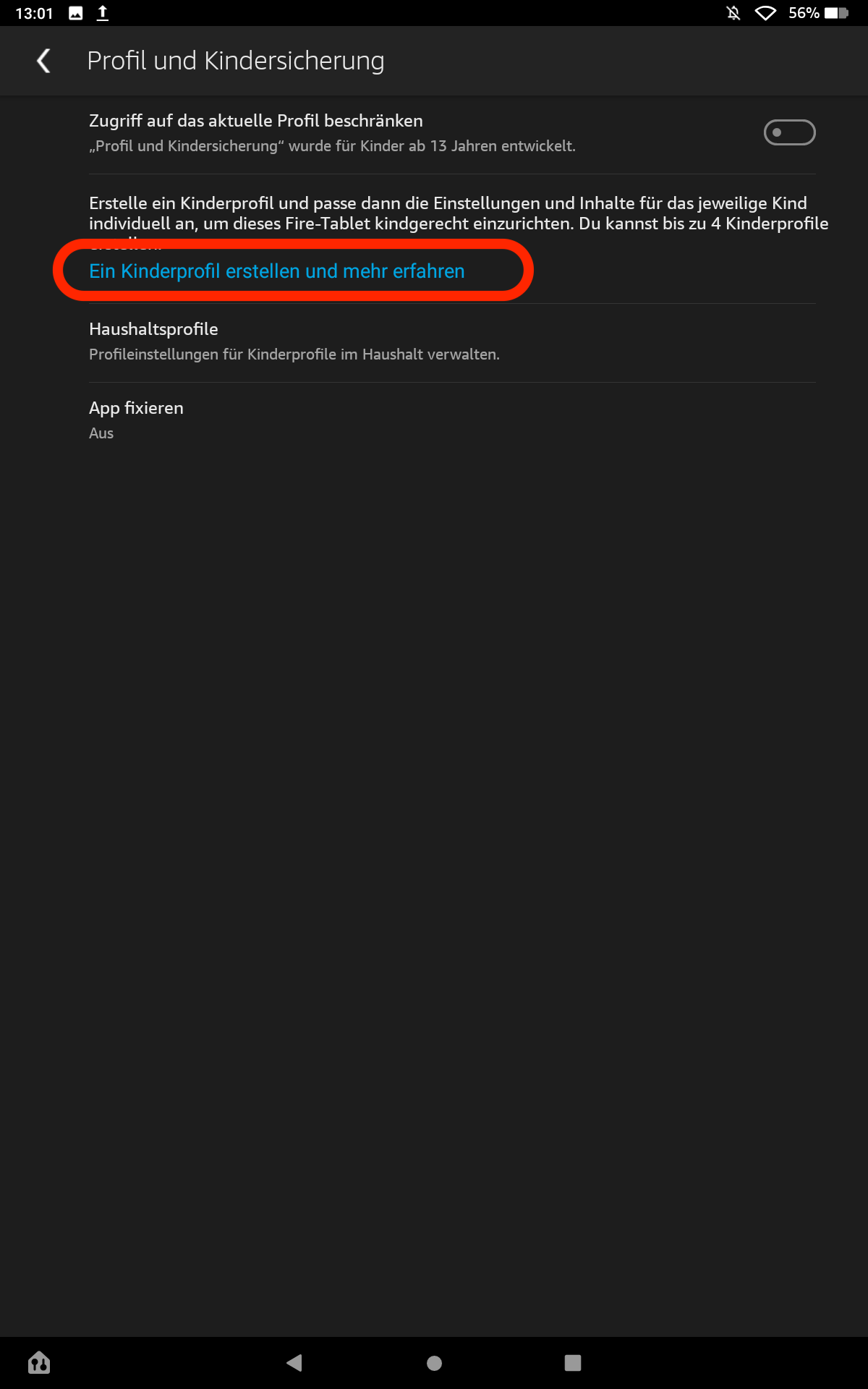 Sollten Sie bereits Ihr Amazon FireOS Tablet ohne Kinderprofil eingerichtet haben, könne Sie auch im Nachhinein noch ein Kinderprofil erstellen: