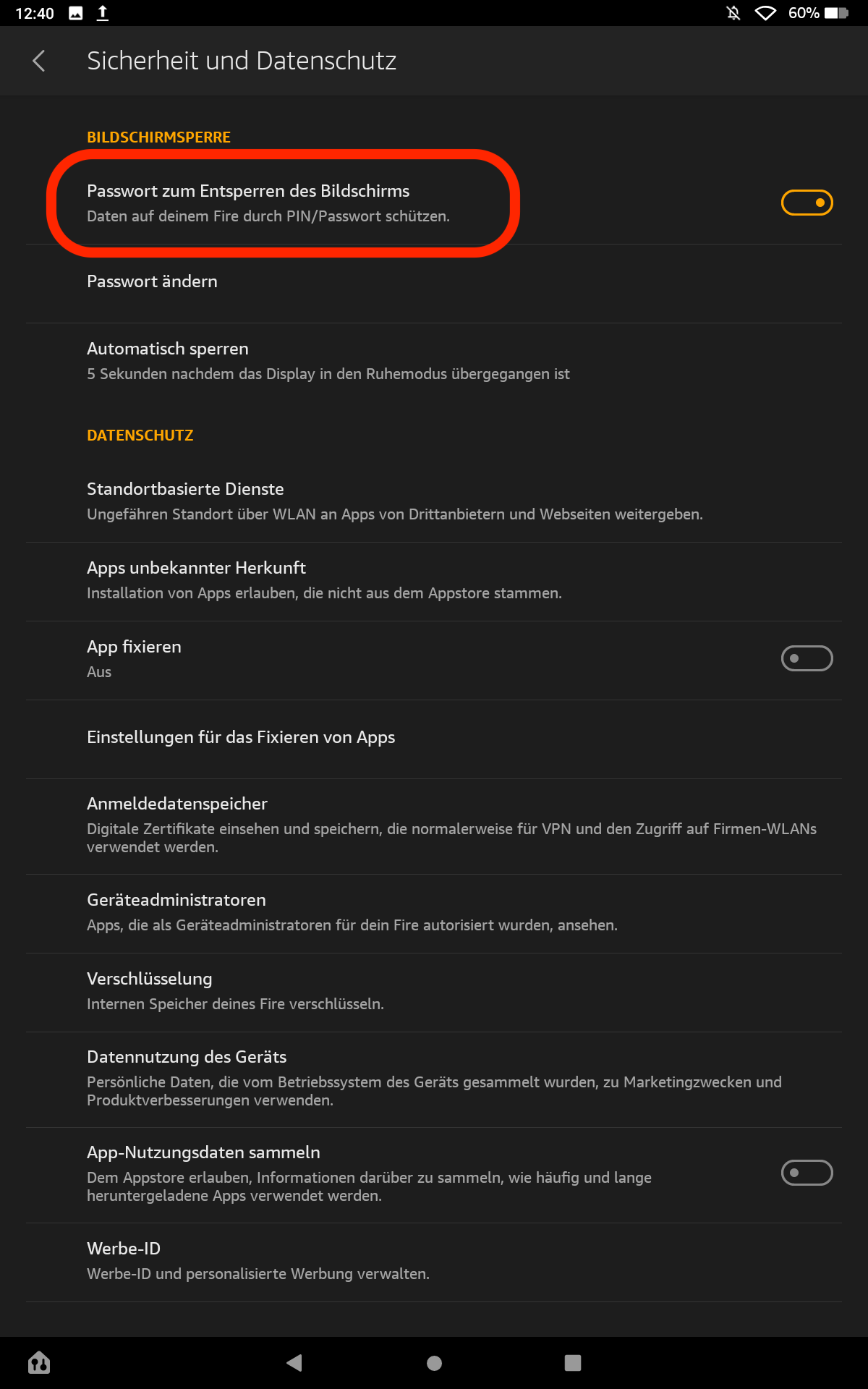 Sie können festlegen, dass zur Entsperrung des Tablets ein Passwort erforderlich ist: