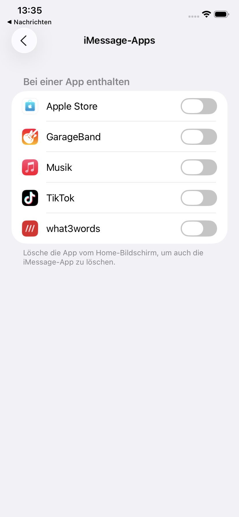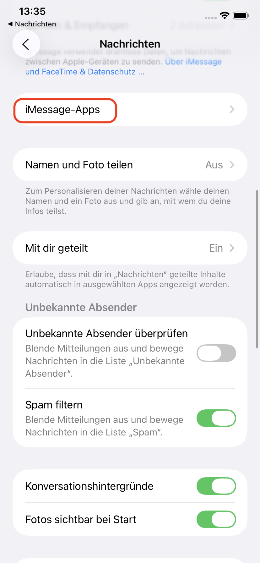 5. Es öffnet sich ein neues Fenster. Scrollen Sie hoch zu iMessages-Apps.