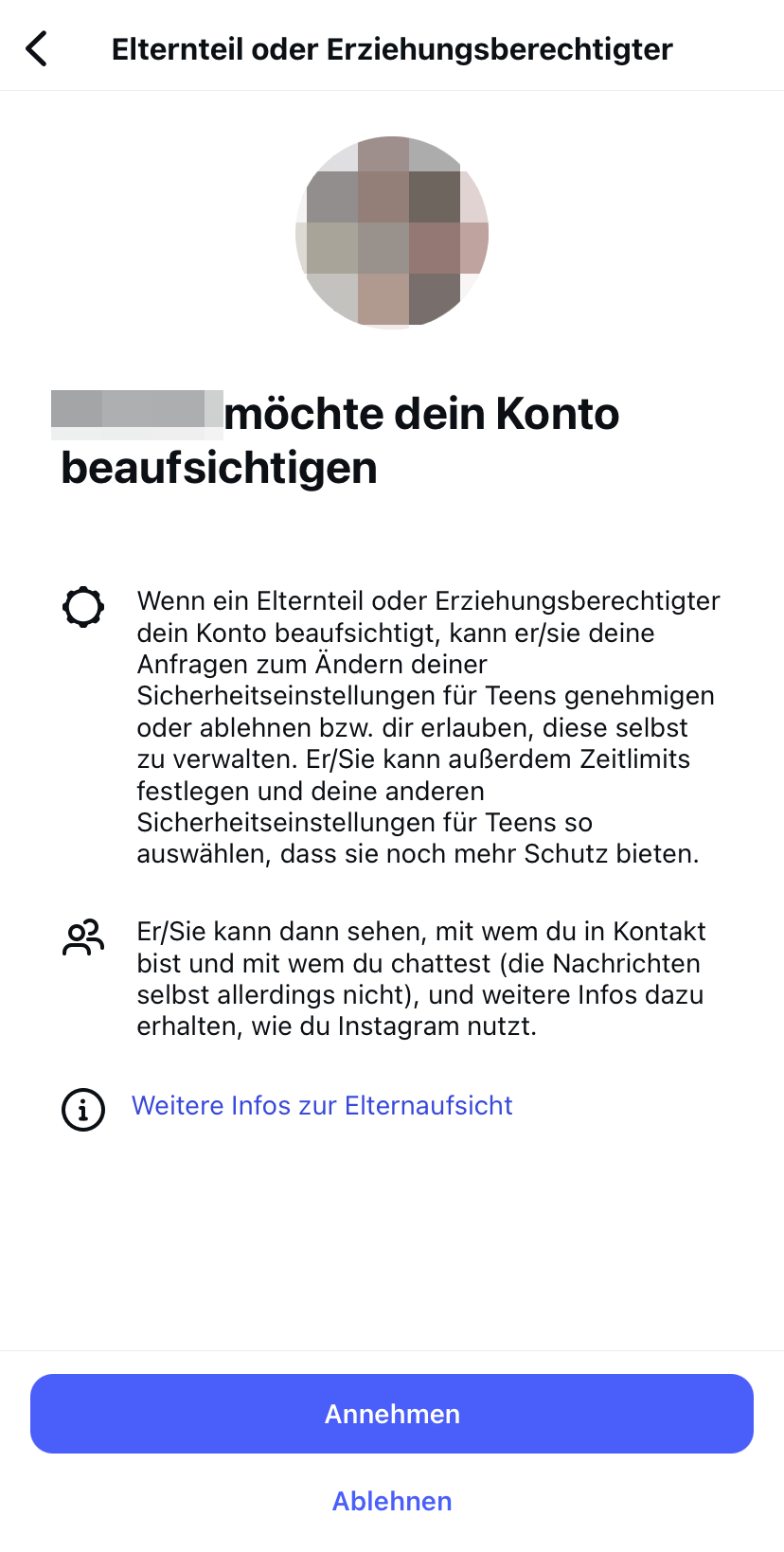 Für die Nutzung der Elternaufsicht müssen sowohl Sie als auch Ihr Kind bei Instagram registriert sein. Sie können eine Einladung zur Elternaufsicht senden, die Ihr Kind annehmen muss. Die Aufsicht endet automatisch, wenn Ihr Kind 18 Jahre alt wird. Daher ist es wichtig, dass das Geburtsdatum korrekt angegeben wird. Wie Sie das Geburtsdatum im Nachhinein ändern können finden Sie im Kapitel Altersänderungen vornehmen.