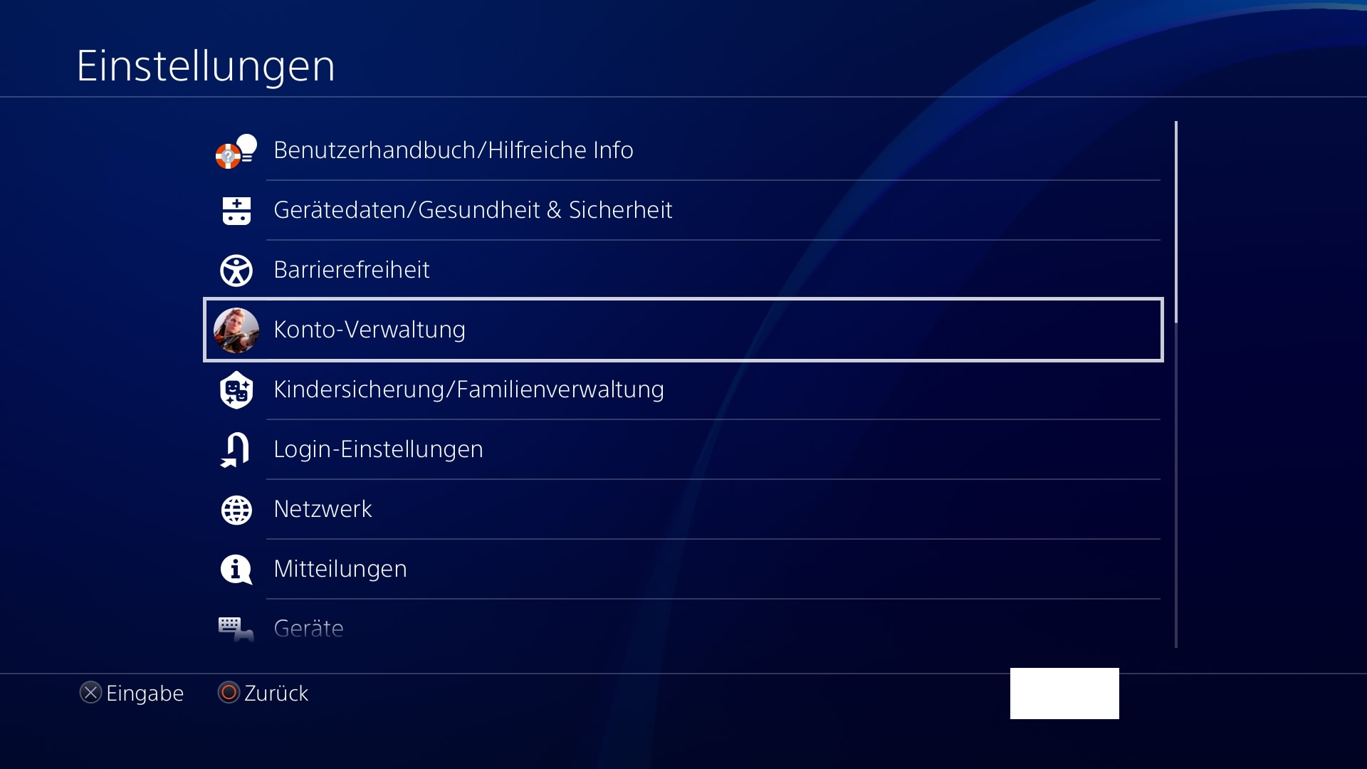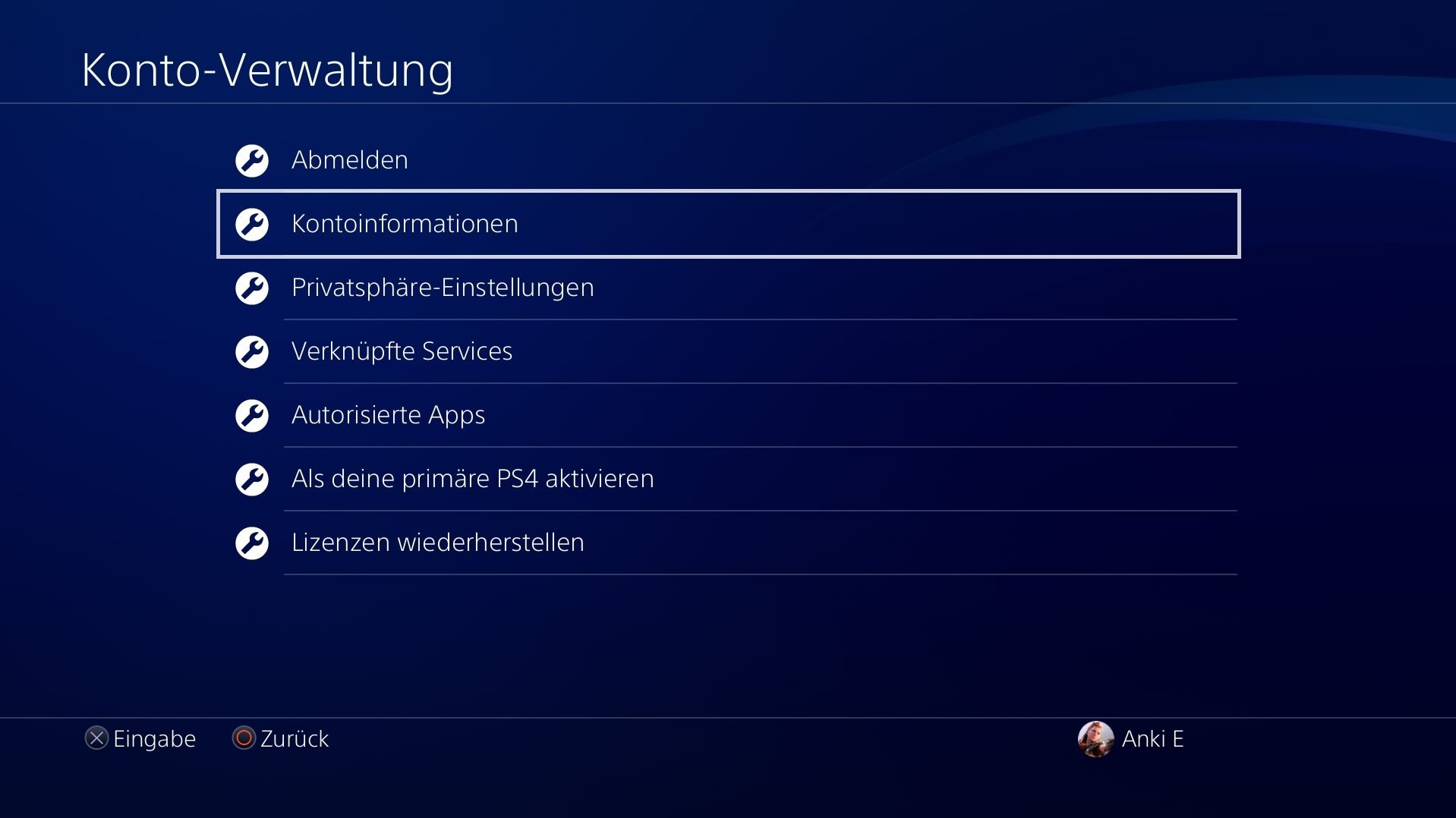 Navigieren Sie sich durch die Einstellungen mithilfe der Pfeiltasten am Controller. Wählen Sie Einstellungen mit der X-Taste aus. Gehen Sie mit der Kreis-Taste zurück.