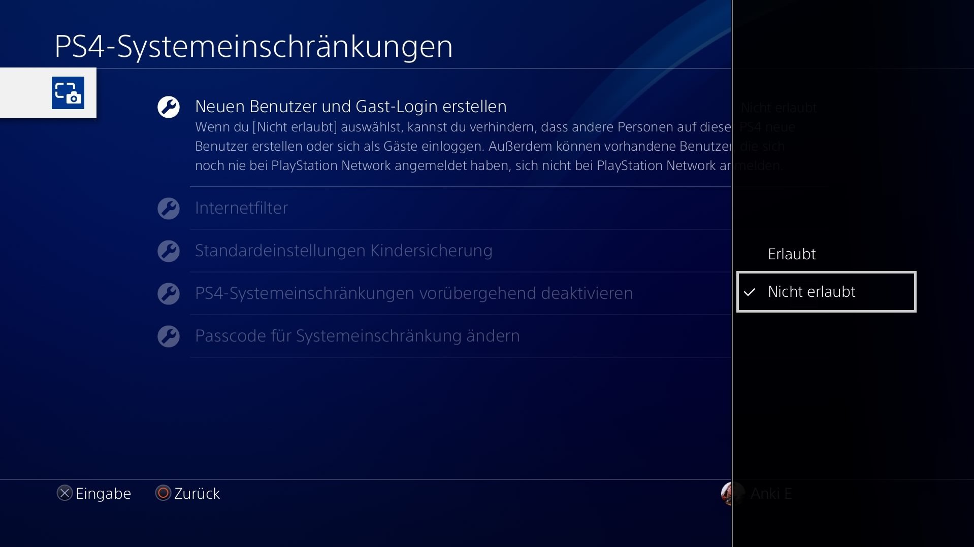 Sie können selbst entscheiden, ob Ihr Kind mit der PS4 im Internet surfen darf. Schalten Sie die PS4 ein und wählen Sie Ihr eigenes Konto aus (bzw. das, des PS4-Administrators).