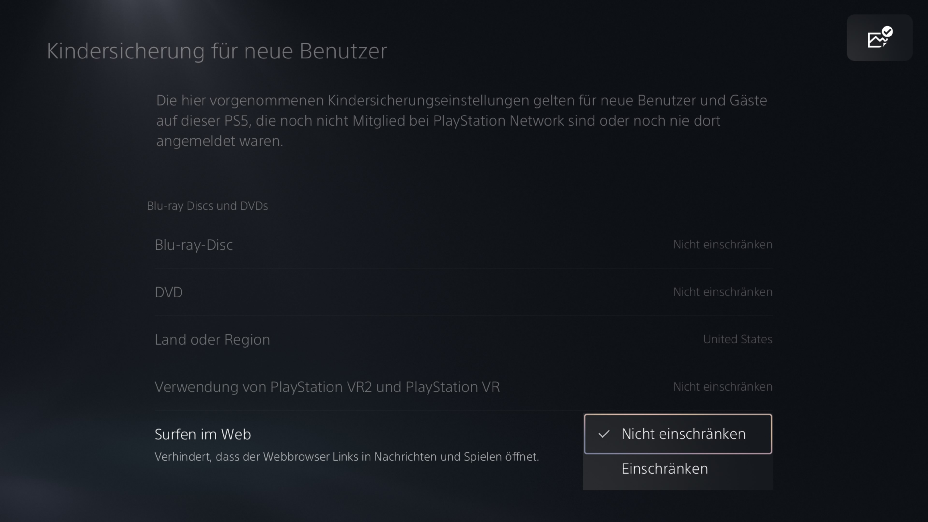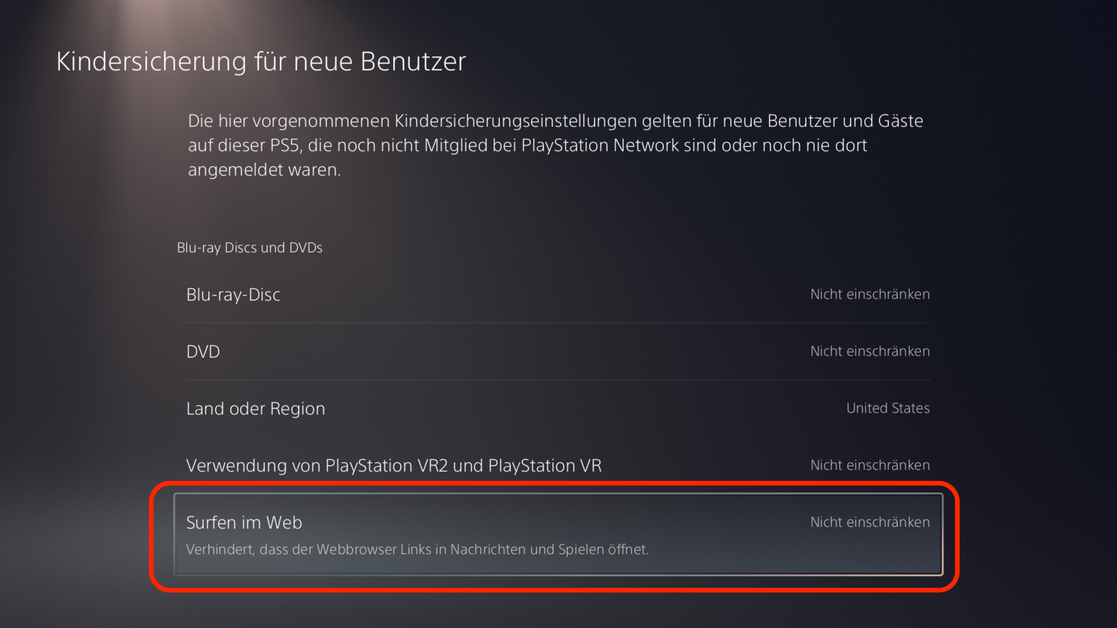 Sie können selbst entscheiden, ob Ihr Kind mit der PS5 im Internet surfen darf. Sie können das Surfen im Web deaktivieren: