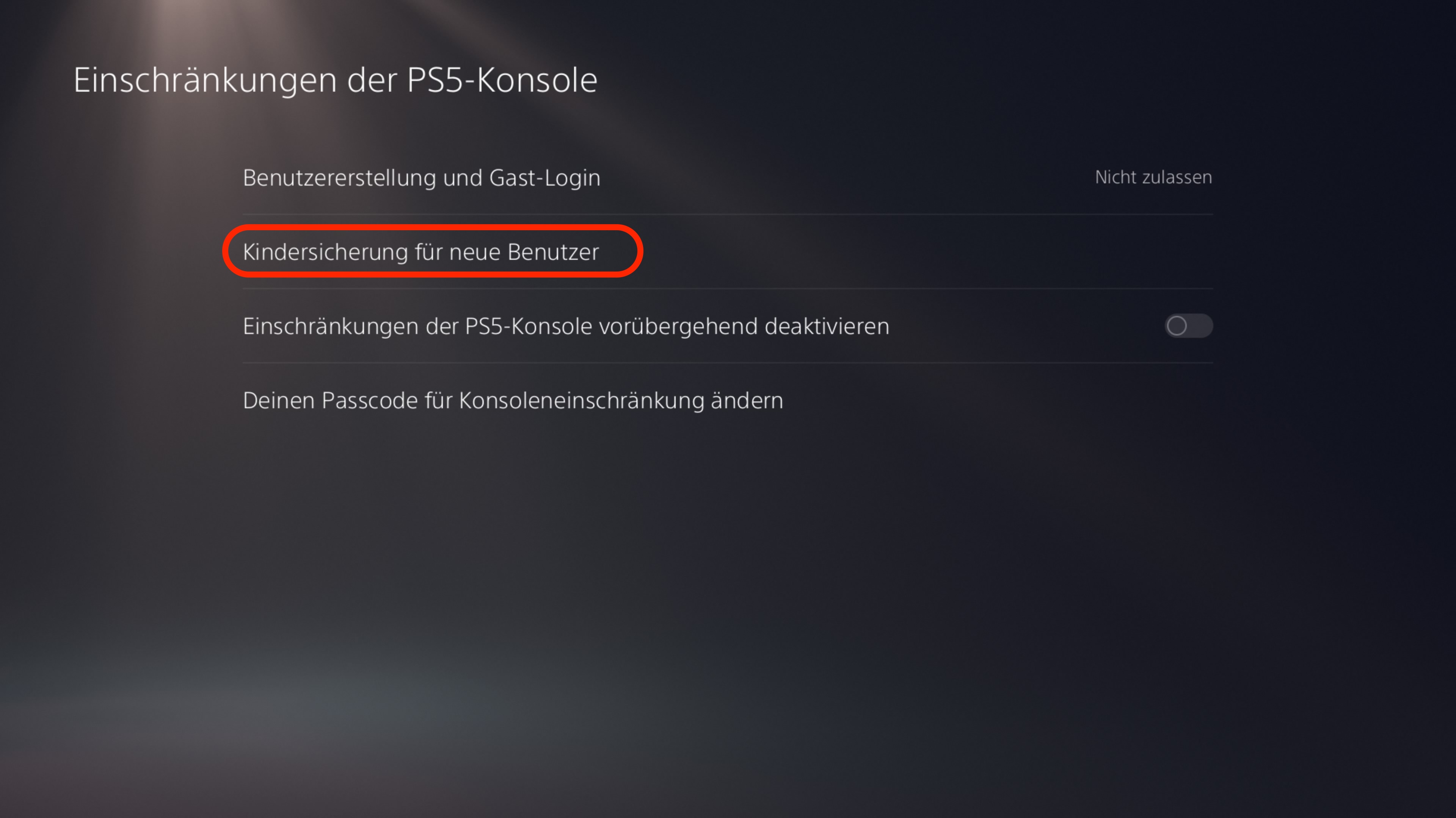6. Wählen Sie Kindersicherung für neue Benutzer.