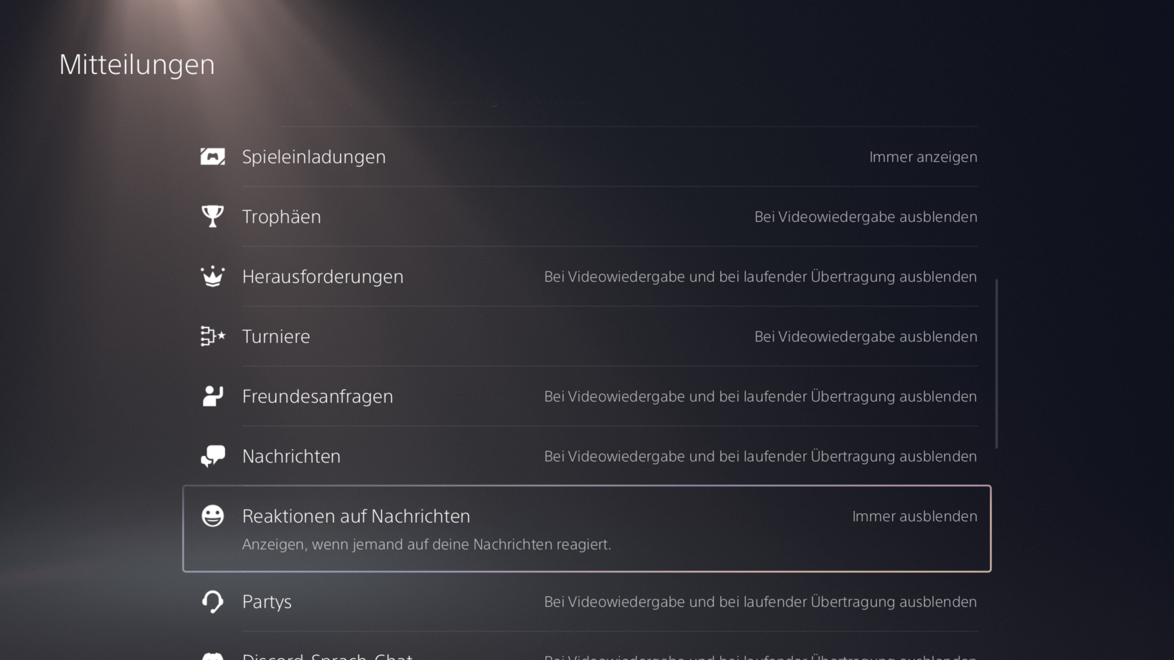 4. Navigieren Sie mit dem Pfeil nach unten zu Reaktionen auf Nachrichten.