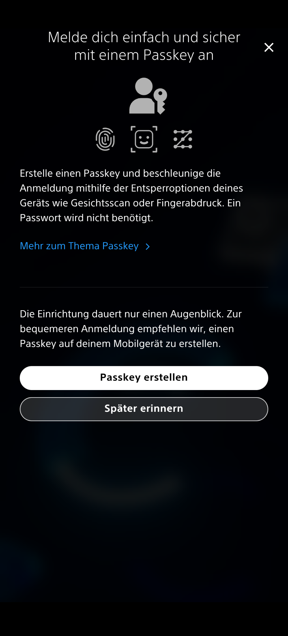 Die Playstation App ermöglicht es auch sich über einen Passkey in der App schneller anzumelden. Ein Passkey ist eine Entsperroption des Gerätes wie ein Gesichtsscan oder ein Fingerabdruck. Dann kann sich Ihr Kind in Zukunft ohne Passwort anmelden. Dieser Passkey ist auf dem Gerät gespeichert. Wir empfehlen diesen bei der Erstanmeldung noch nicht fest zu legen. Dadurch kann Ihr Kind sich nicht selbst in der App anmelden (soweit es die Anmeldedaten für sein Konto nicht kennt) und Einstellungen vornehmen.